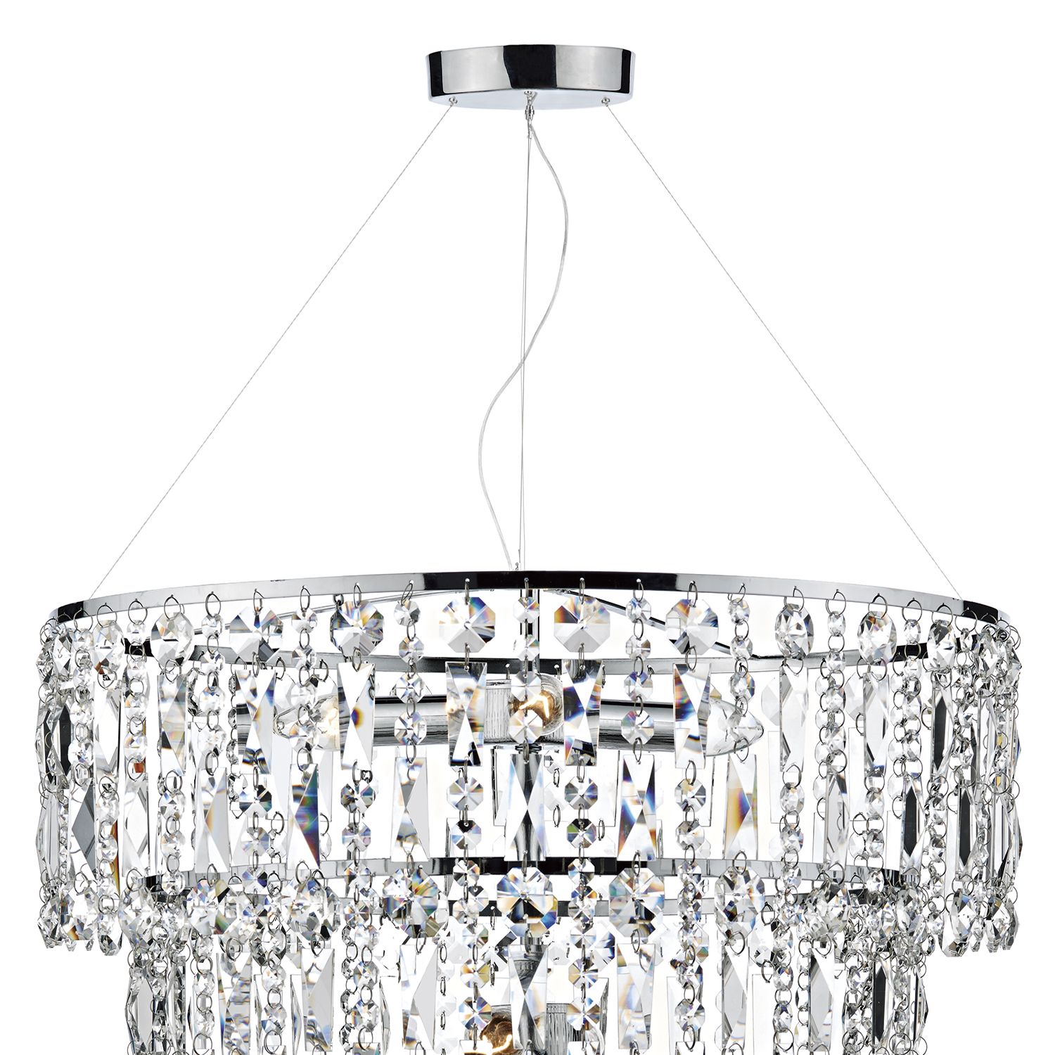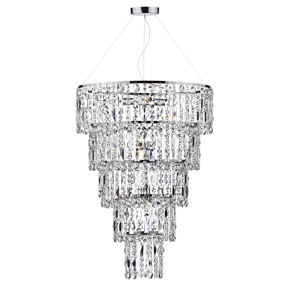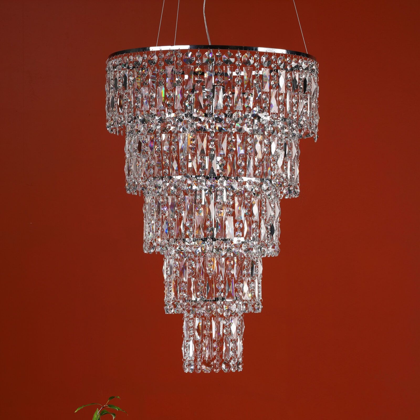 Luxury glass crystal pieces arranged on a polished chrome frame in 5 tiers for a waterfall effect. With 6 SES lamp holders this fitting is suitable for retro fit LED lamps. Height adjustable on installation and supplied with 1 meter of cable.