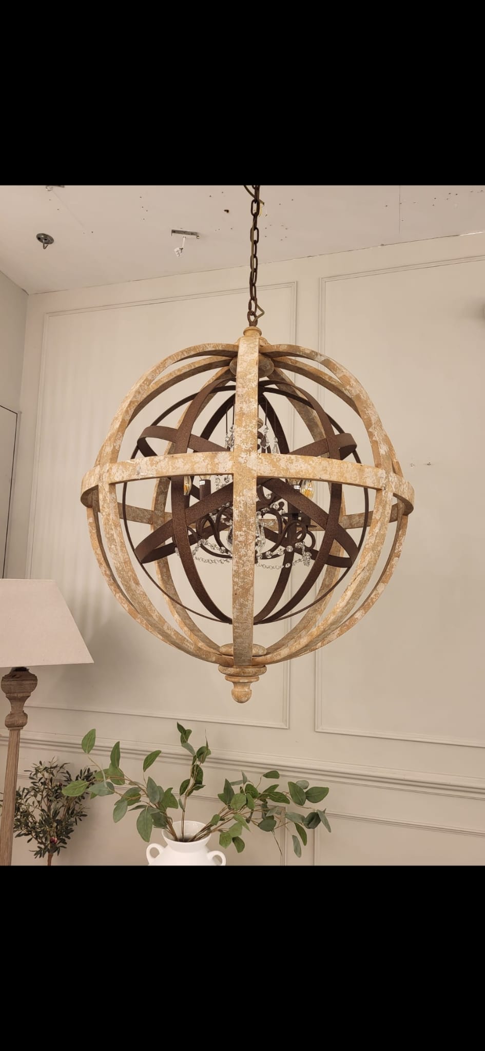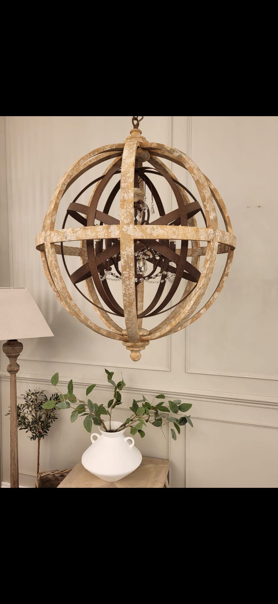 Elevate any space with the stunning Essie Metal Globe Chandelier. The metal globe design, adorned with sparkling crystals and a wooden surround, creates a sophisticated and elegant atmosphere. Add a touch of luxury to your home with this timeless piece.