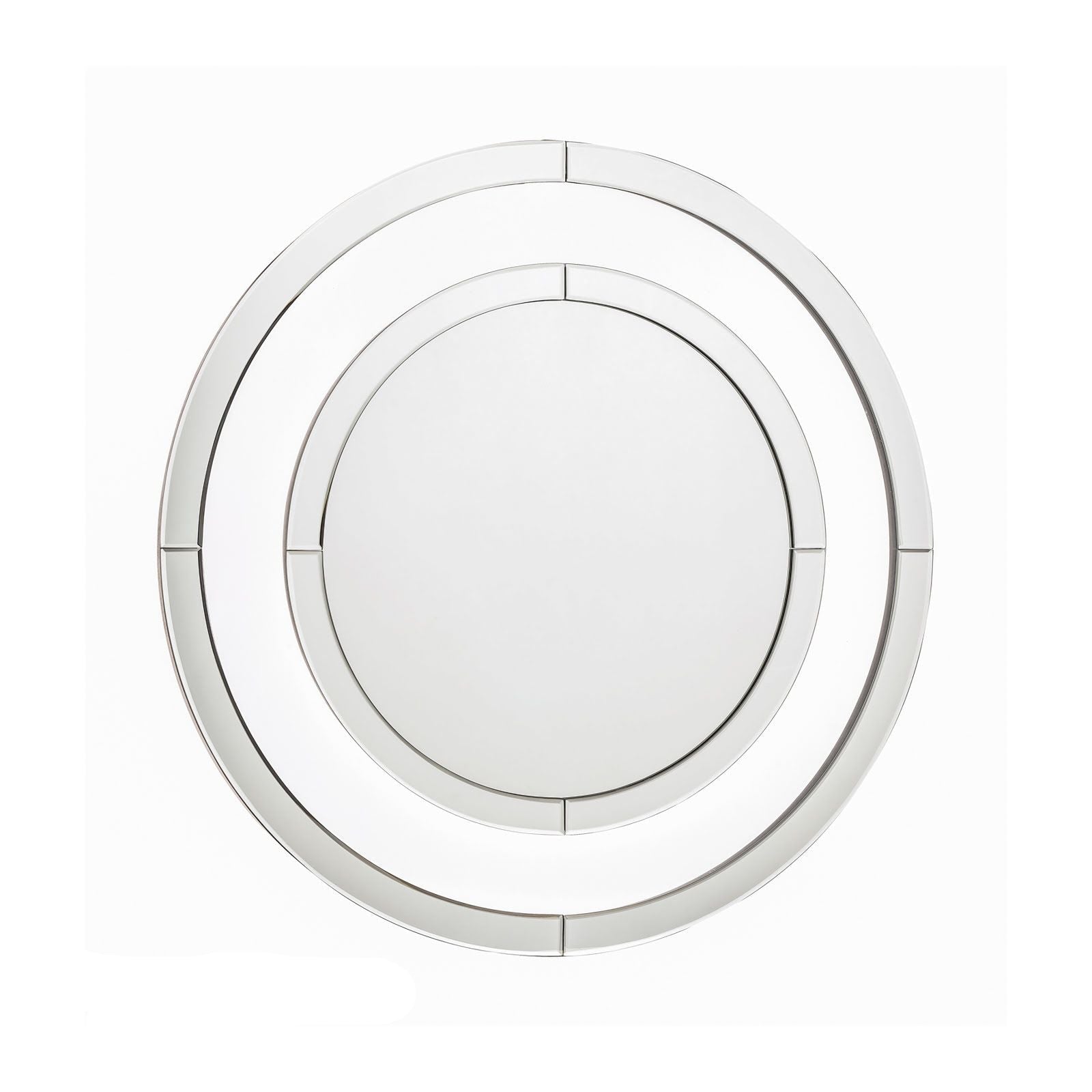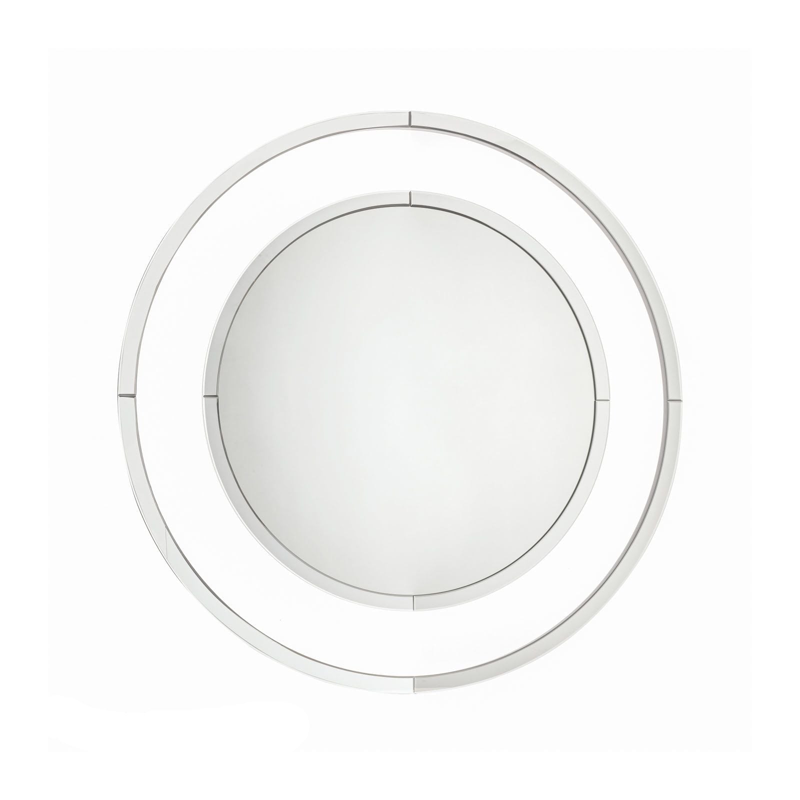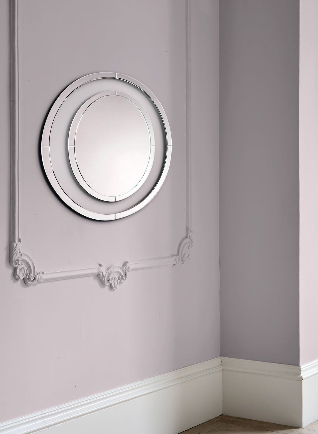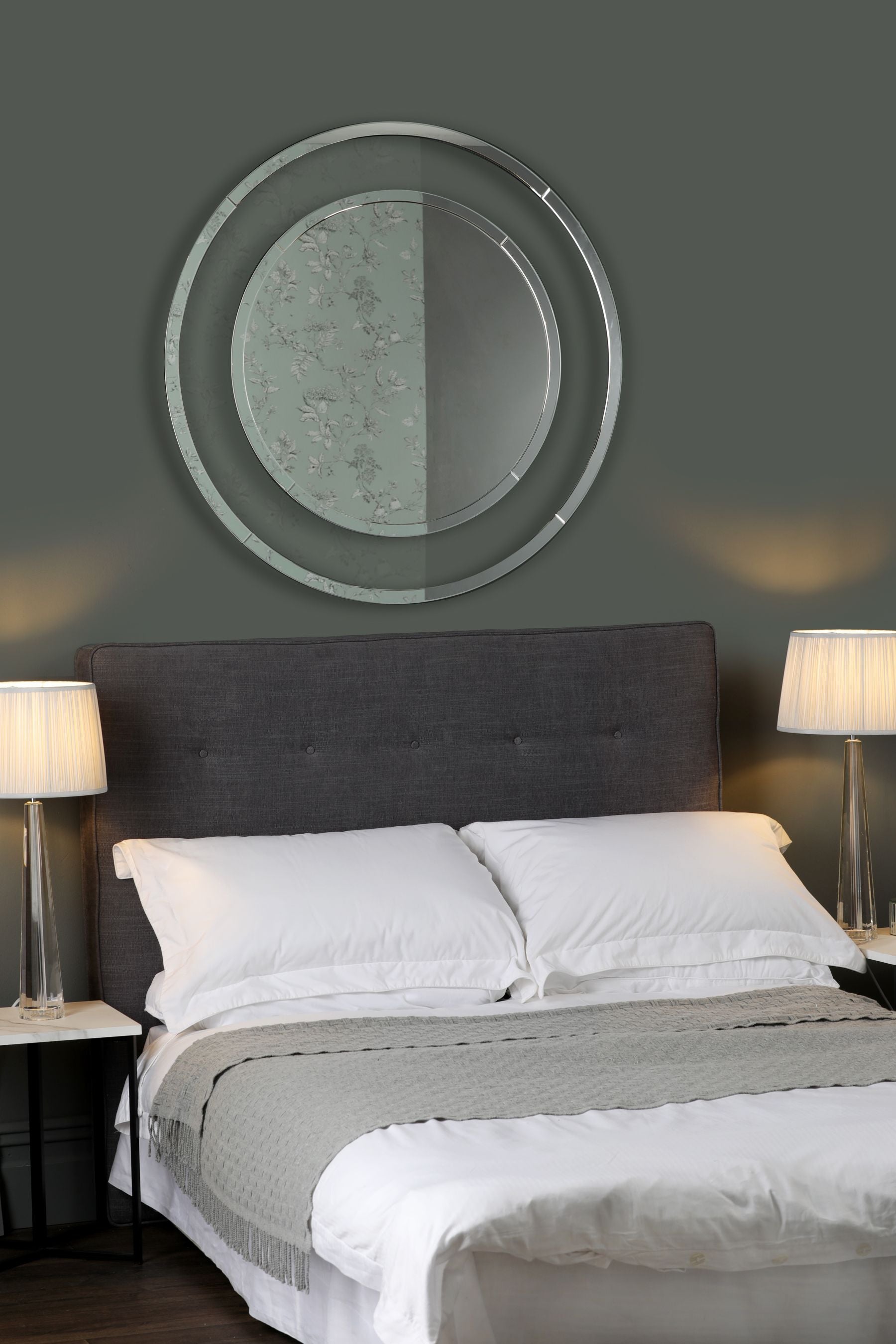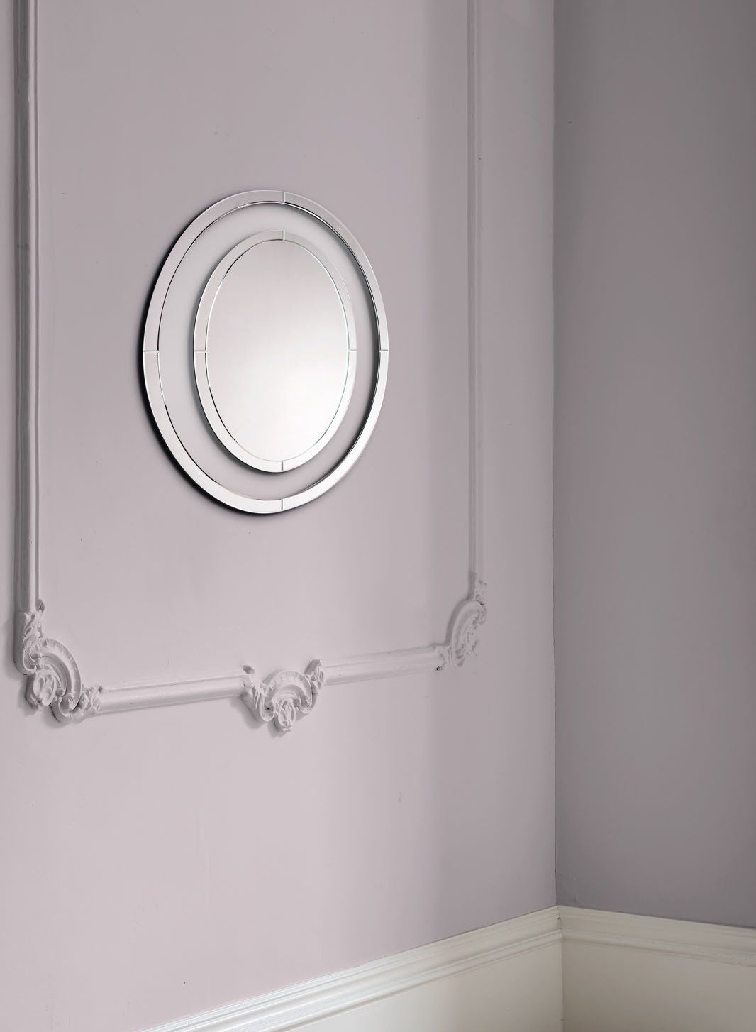 The Evie collection features a transparent glass rim trimmed with mirror around the actual mirror, which itself is mirror trimmed. This mirror within a mirror effect is most unusual, as the mirror appears to float above the background, whether it is wallpaper or a painted surface. This is a great trick to ensure the small round Evie mirror fits in with your decor!