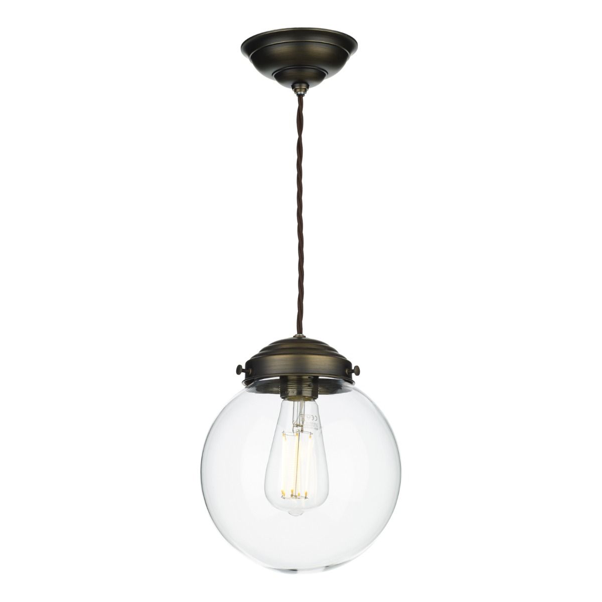Fairfax 1 light pendant with hand blown clear glass and solid brass metal work finished in antique brass.