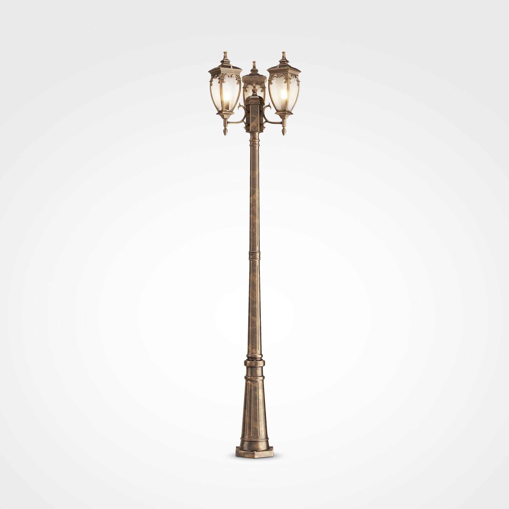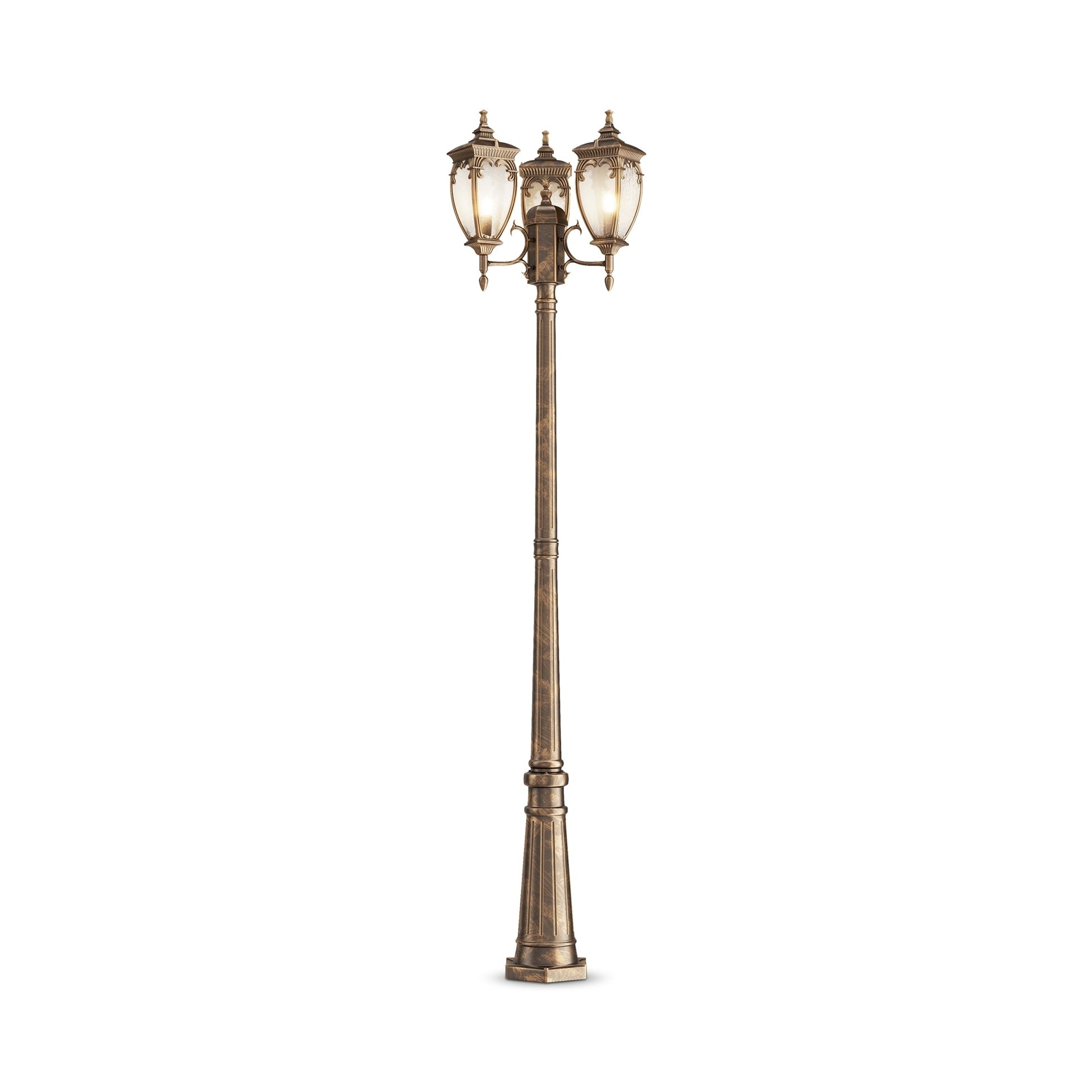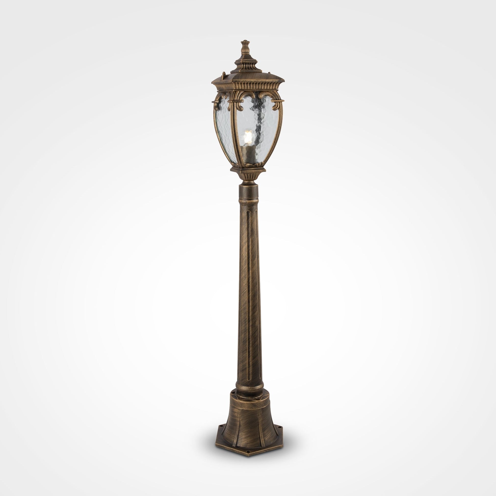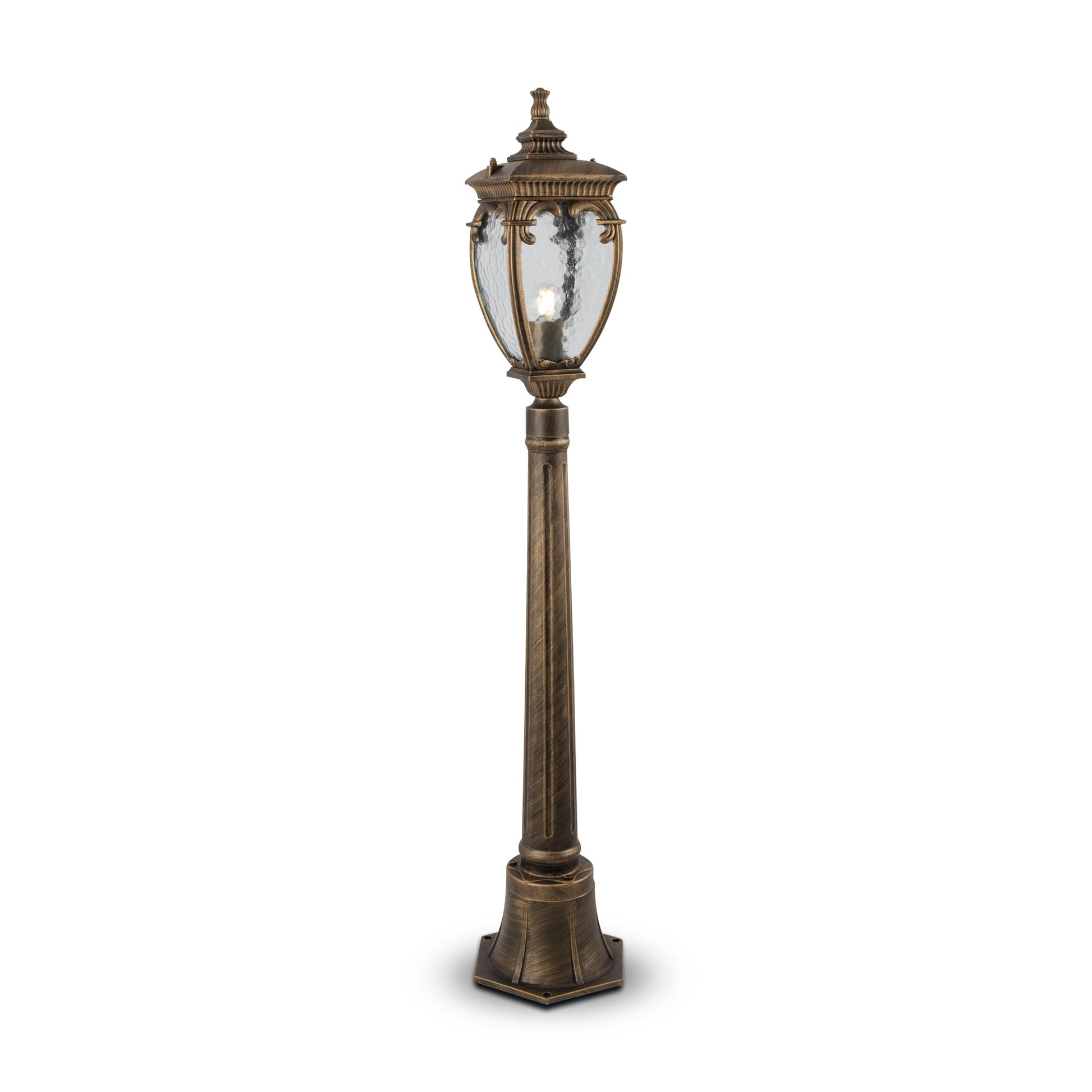 Aluminum housing in two shades: black with gold and antique bronze. Dome light – PULEGOSO glass. Wide range of products: wall, suspended and floor street light fixtures.