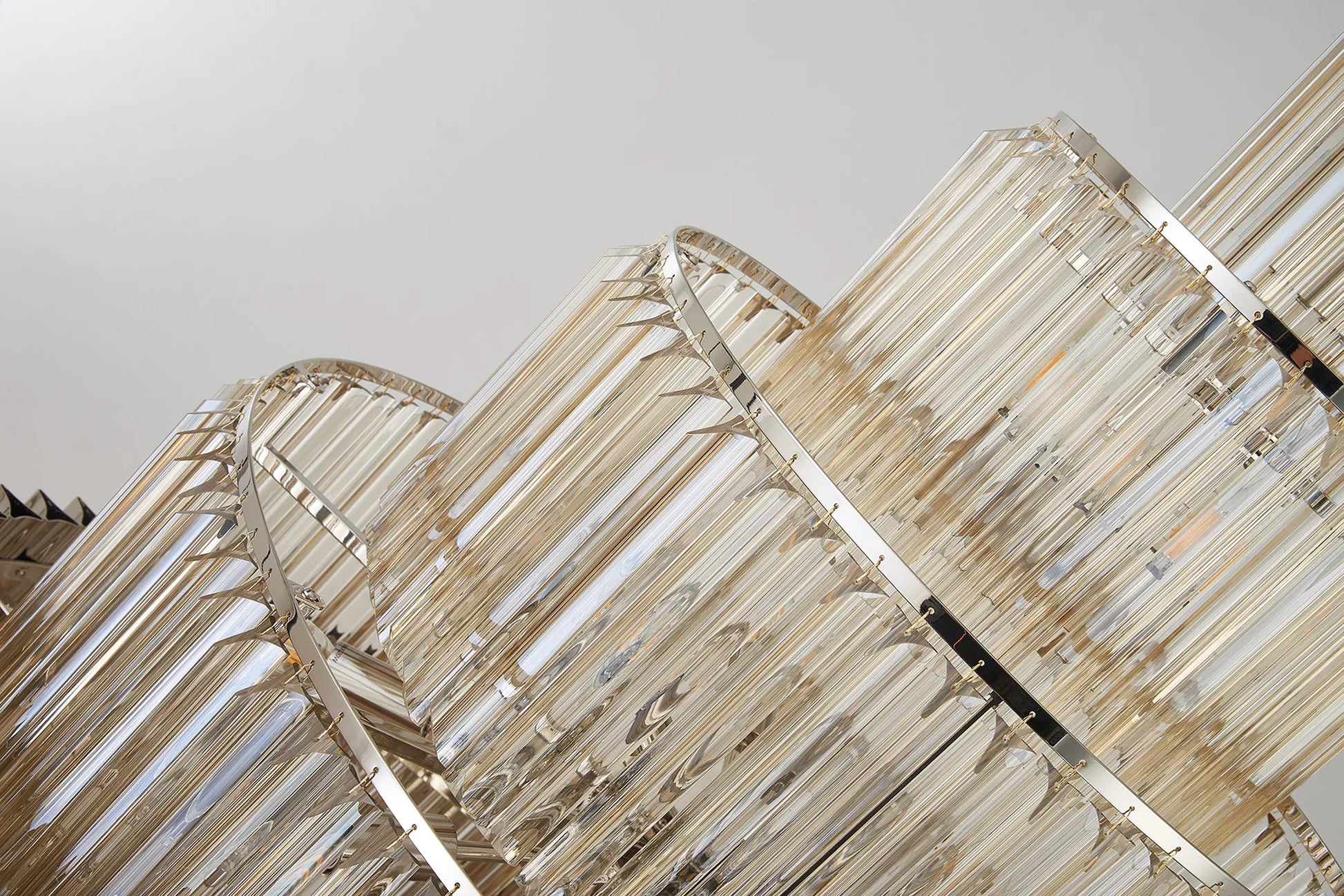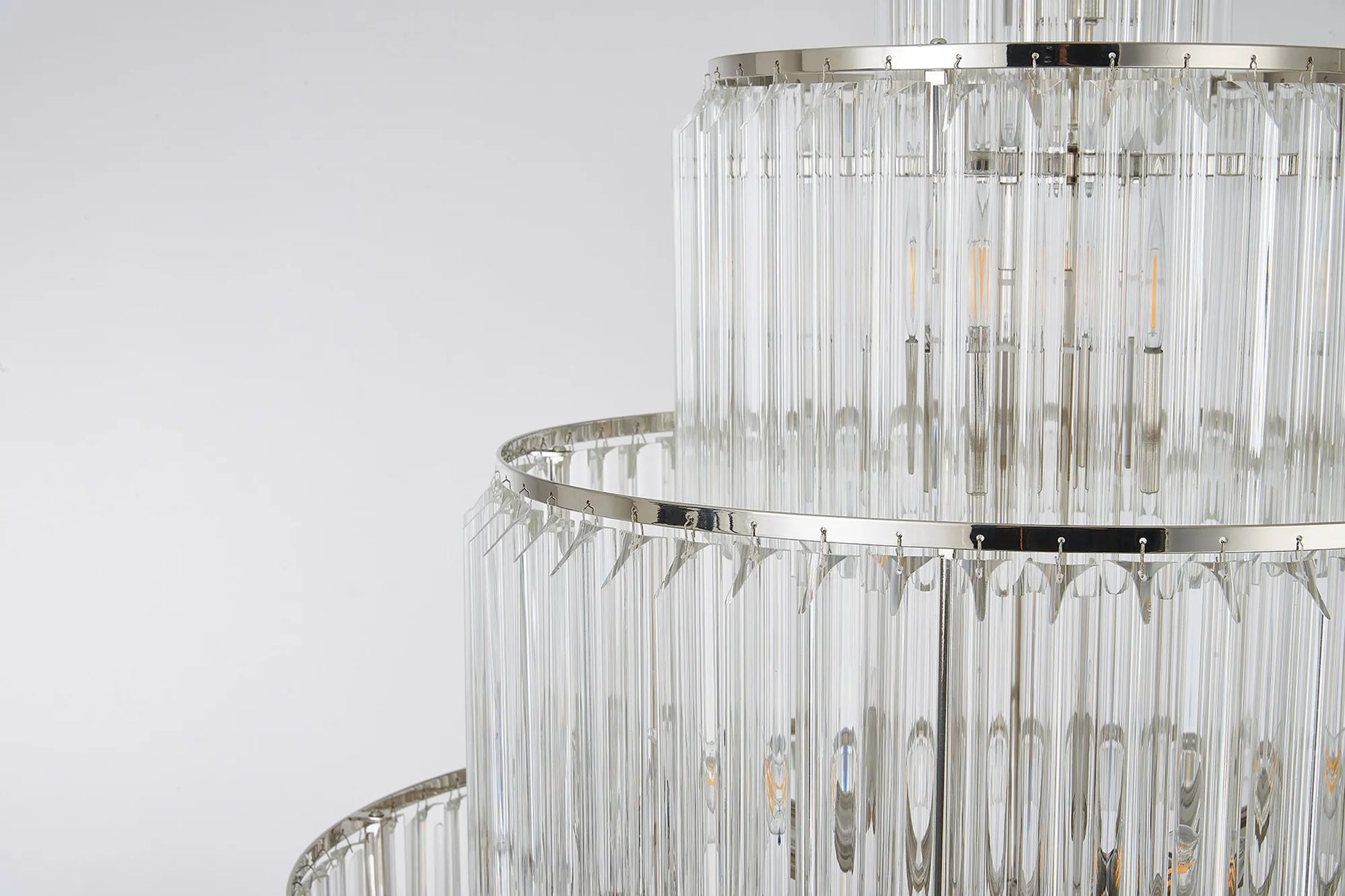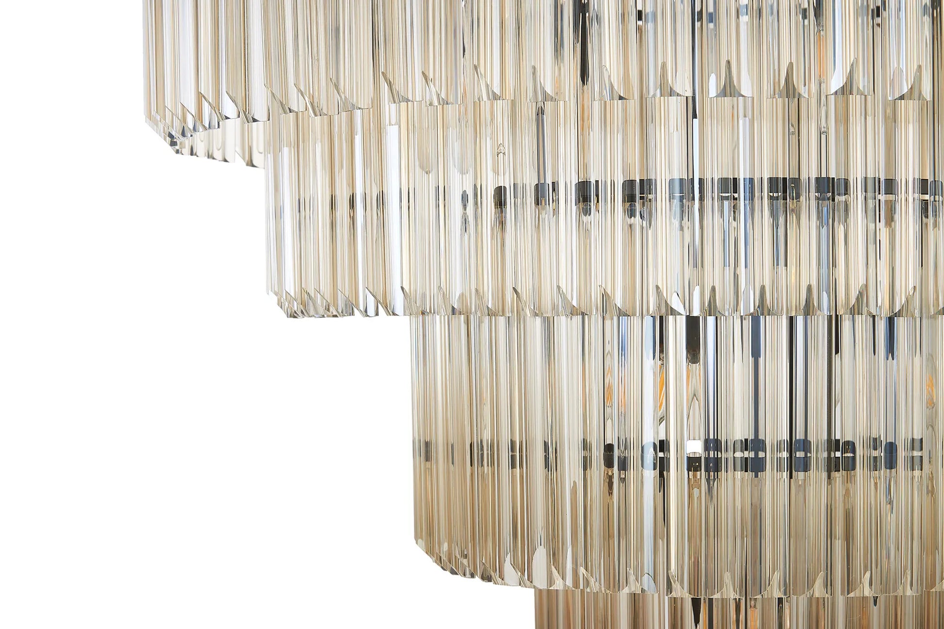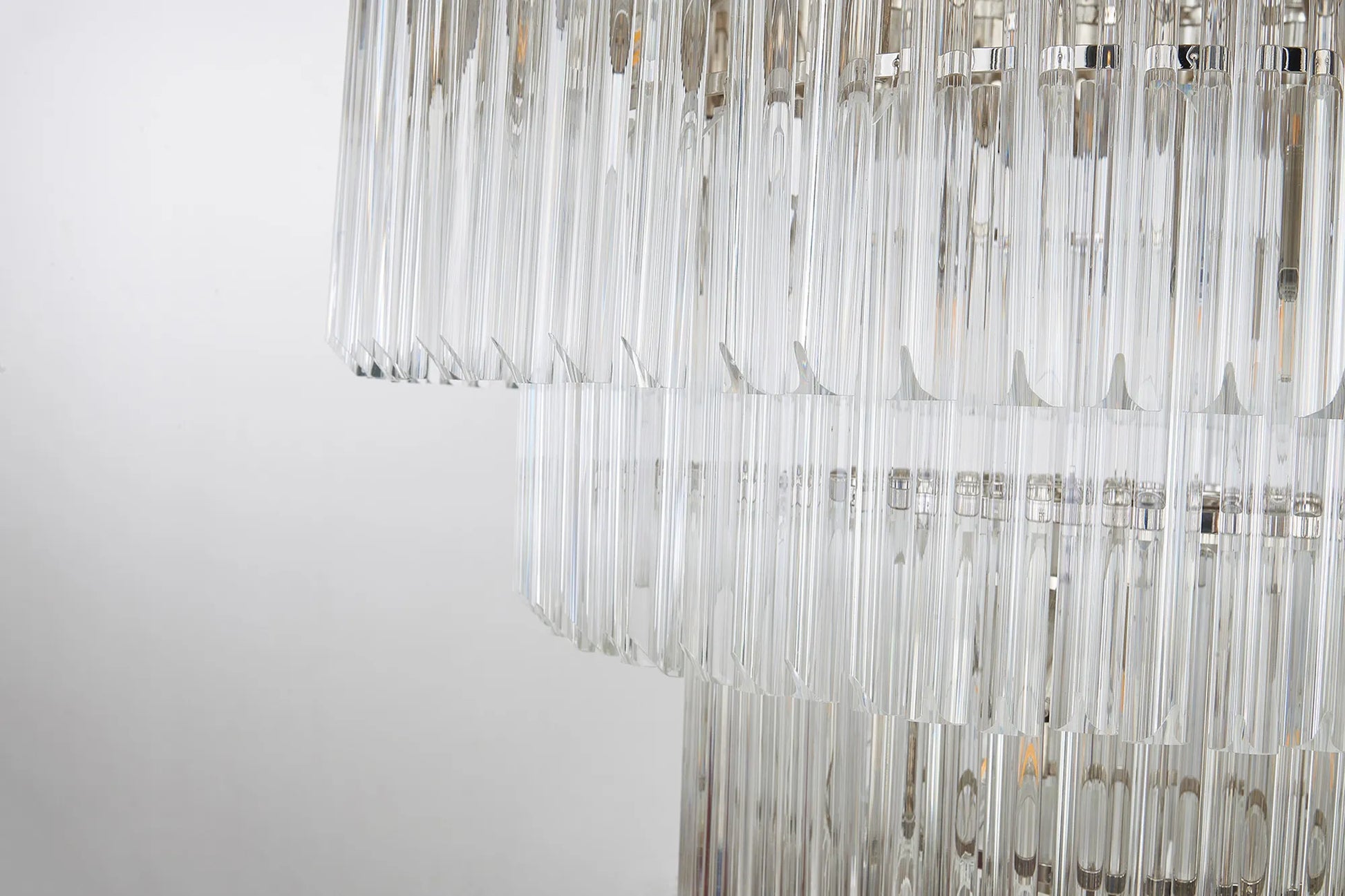 The popularity of the Georgia collections initial release has been so overwhelming that the collection has now been extensively expanded to meet a wider range of specification needs. The long angular shape of the glass which are in a tiered form, can now be found on larger more dramatic designs including a five tier and rectangular pendant to name only a few. Georgia has a traditional regal effect composed with modern materials to create a range suitable for either a modern or more traditional room setting. The unique pyramid forms protruding from the frame provide an intriguing overall shape across this comprehensive collection.