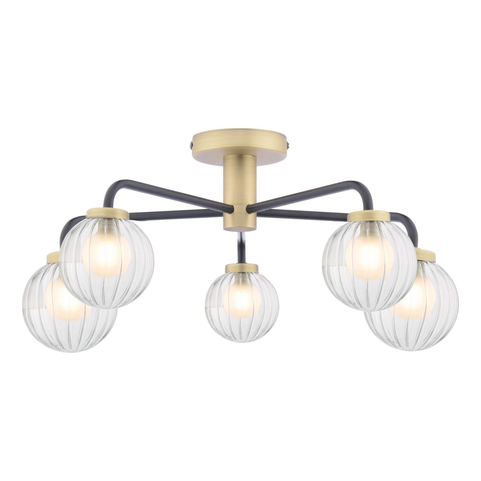 The Gibbs 5 Light Semi-Flush Antique Brass & Glass is a simple 5 light flush ceiling light in contemporary matt black with antique brass accents. The duplex glass shade features a clear ribbed glass outer with an opal inner to reduce glare, allowing light to filter through in an ambient glow. The Gibbs semi-flush is suitable for an entryway, dining room or anywhere a little style is needed.