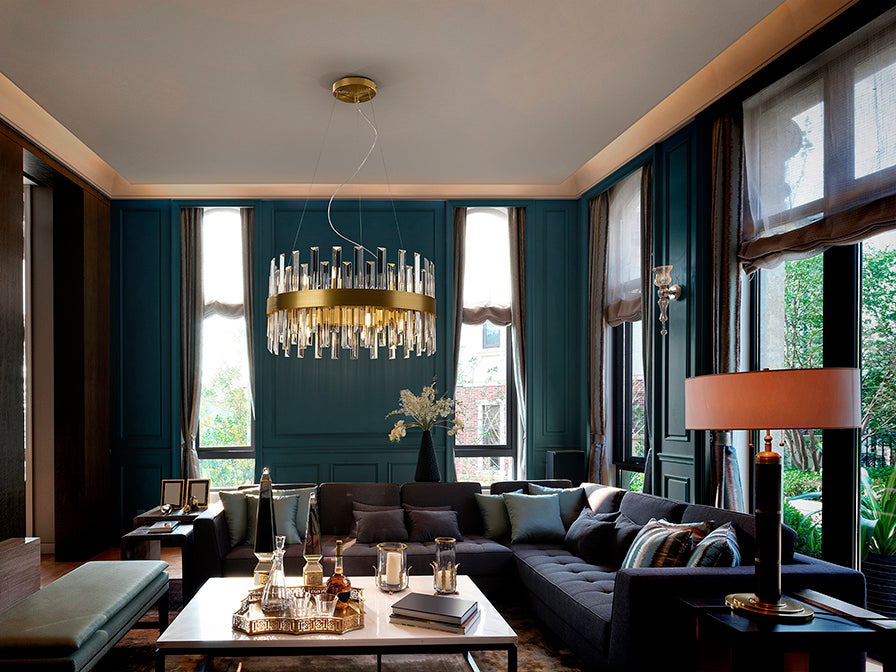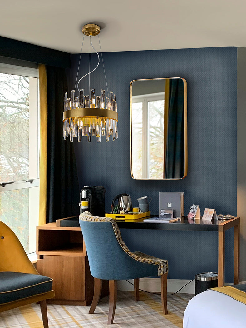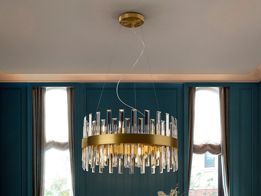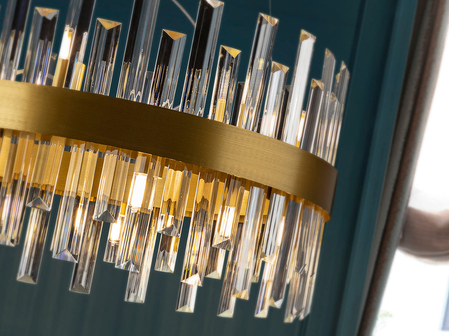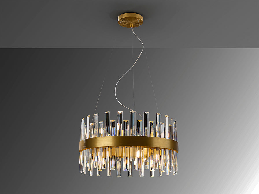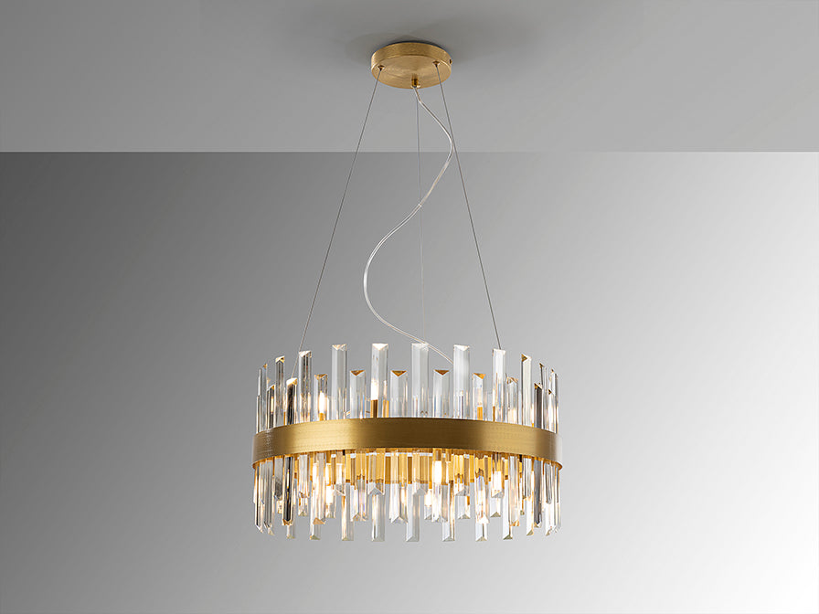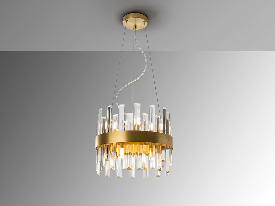 Round lamp of 10 lights, made of brushed metal finished in gold. Clear glass bars diffuser with prism shape.
