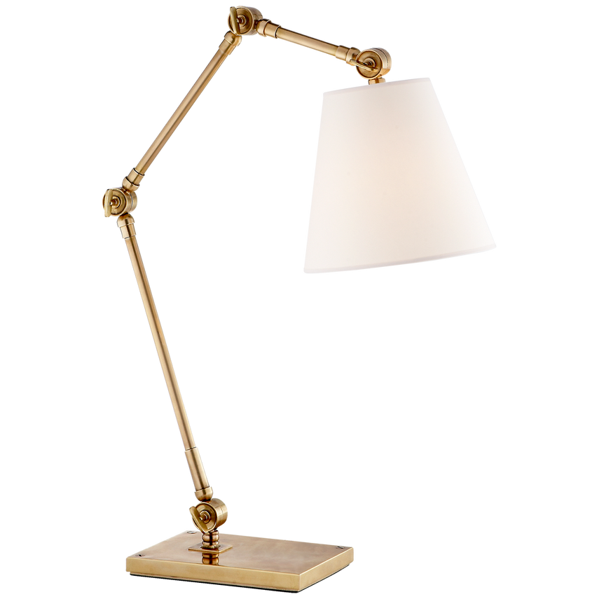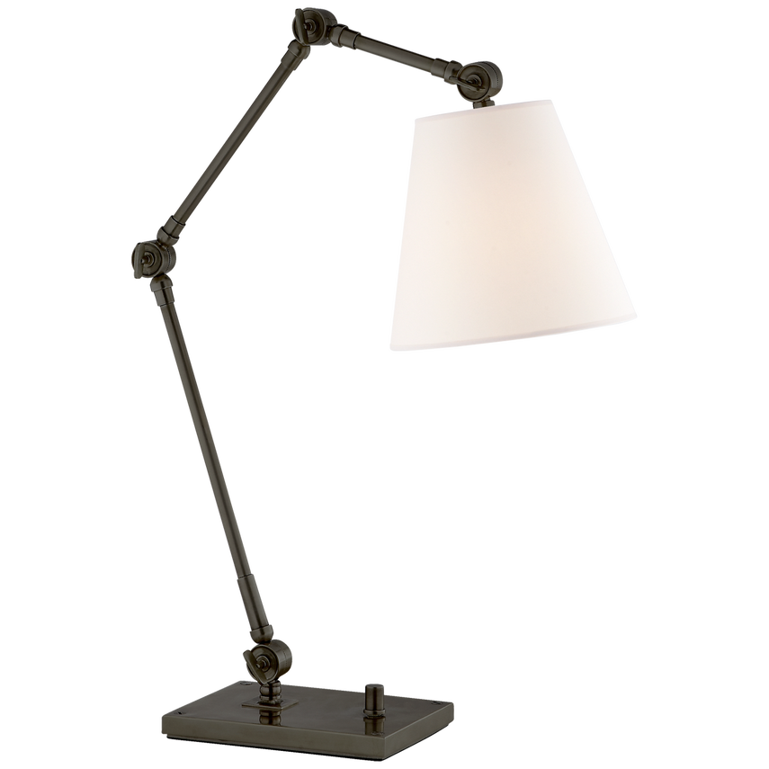 The Graves by Suzanne Kasler is both refined and functional. The articulating arms in bronze, nickel or antique brass convey a vintage, industrial effect. Pivoting heads capped with linen shades focus light where it's needed most in home offices, libraries or any favorite reading area.