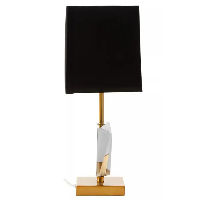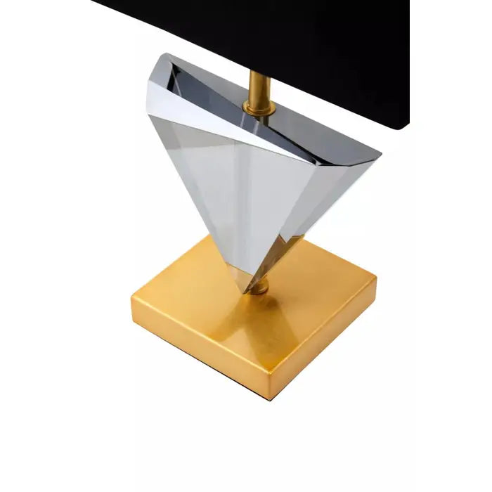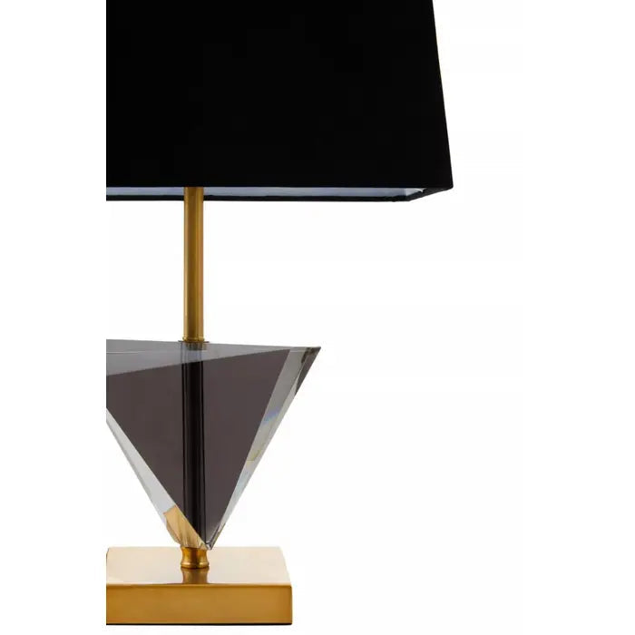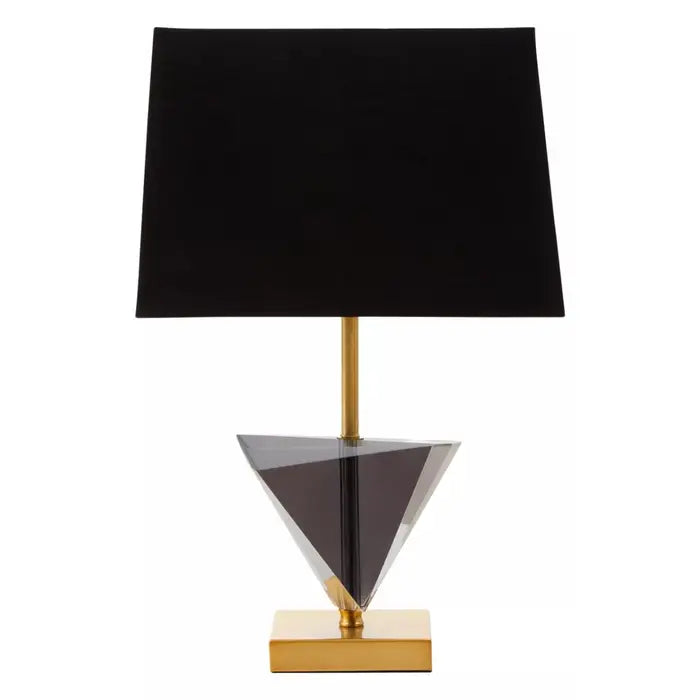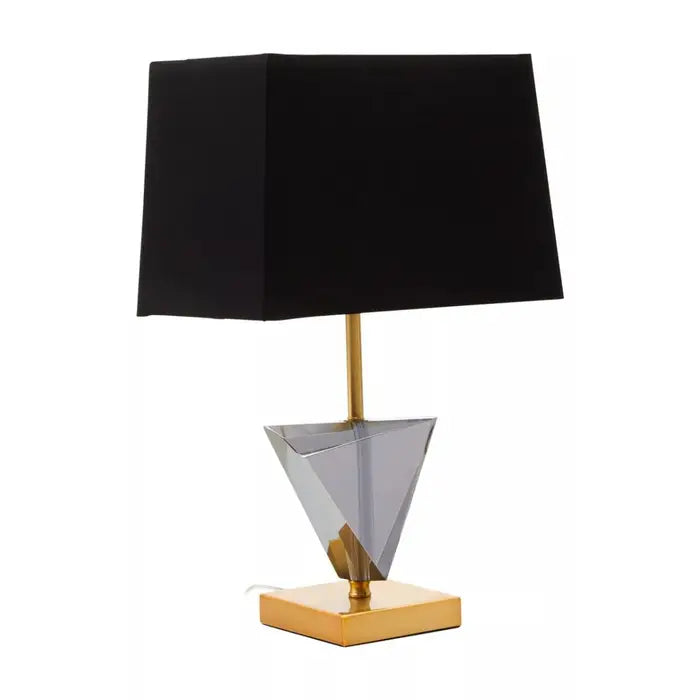 The smoked crystal lamp has a triangular design and a slender gold metal rod. The black shade provides a moden contrast to the gold accent, exuding a quality of contemporary luxury.