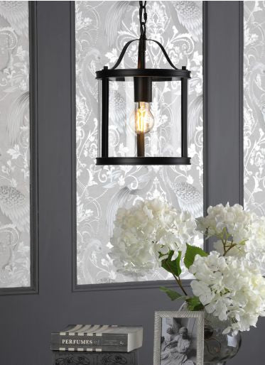 A simple, lantern-style drum-shaped case surrounds a suspended lamp holder, all in a sophisticated black finish for effortlessly elegant looks. The one-light Harrington ceiling pendant is a subtle yet stylish piece to illuminate your favourite room and create a bright, inviting space.