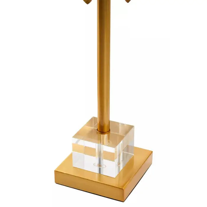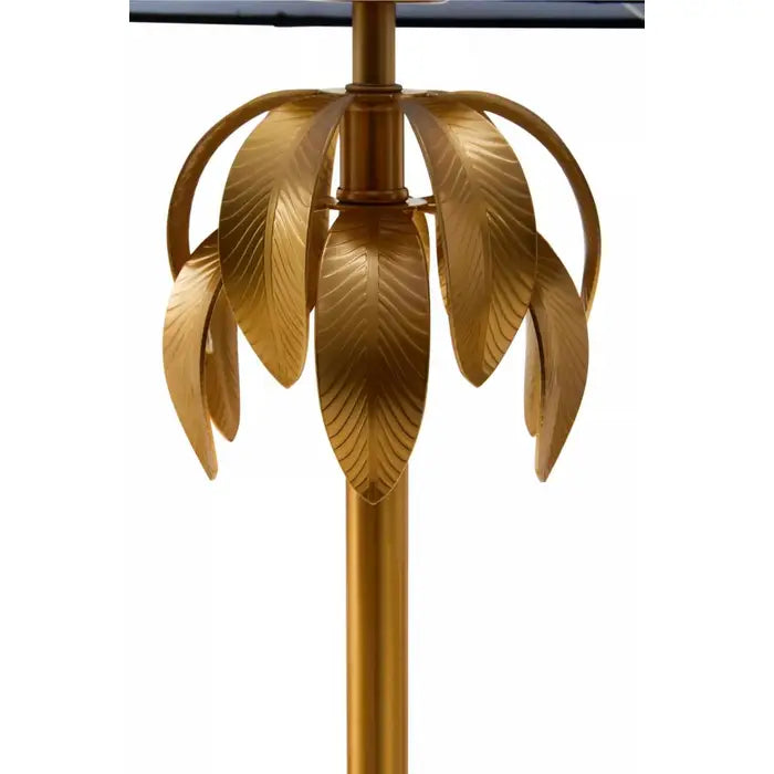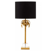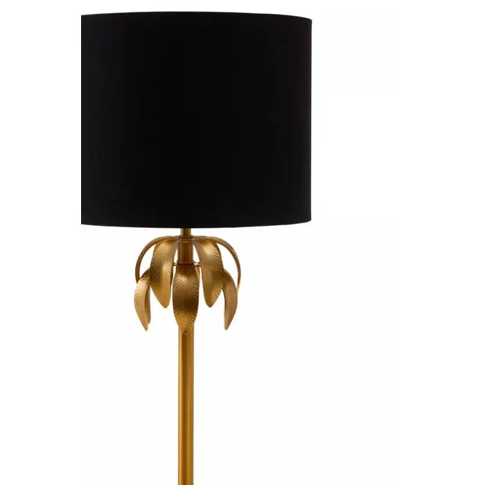 This unique lamp blends natural elements and luxury with its textured canopy of gold leaves and a slim rod frame in gold metal finish. The round black shade and crystal block at the base increase its elegance and beauty.