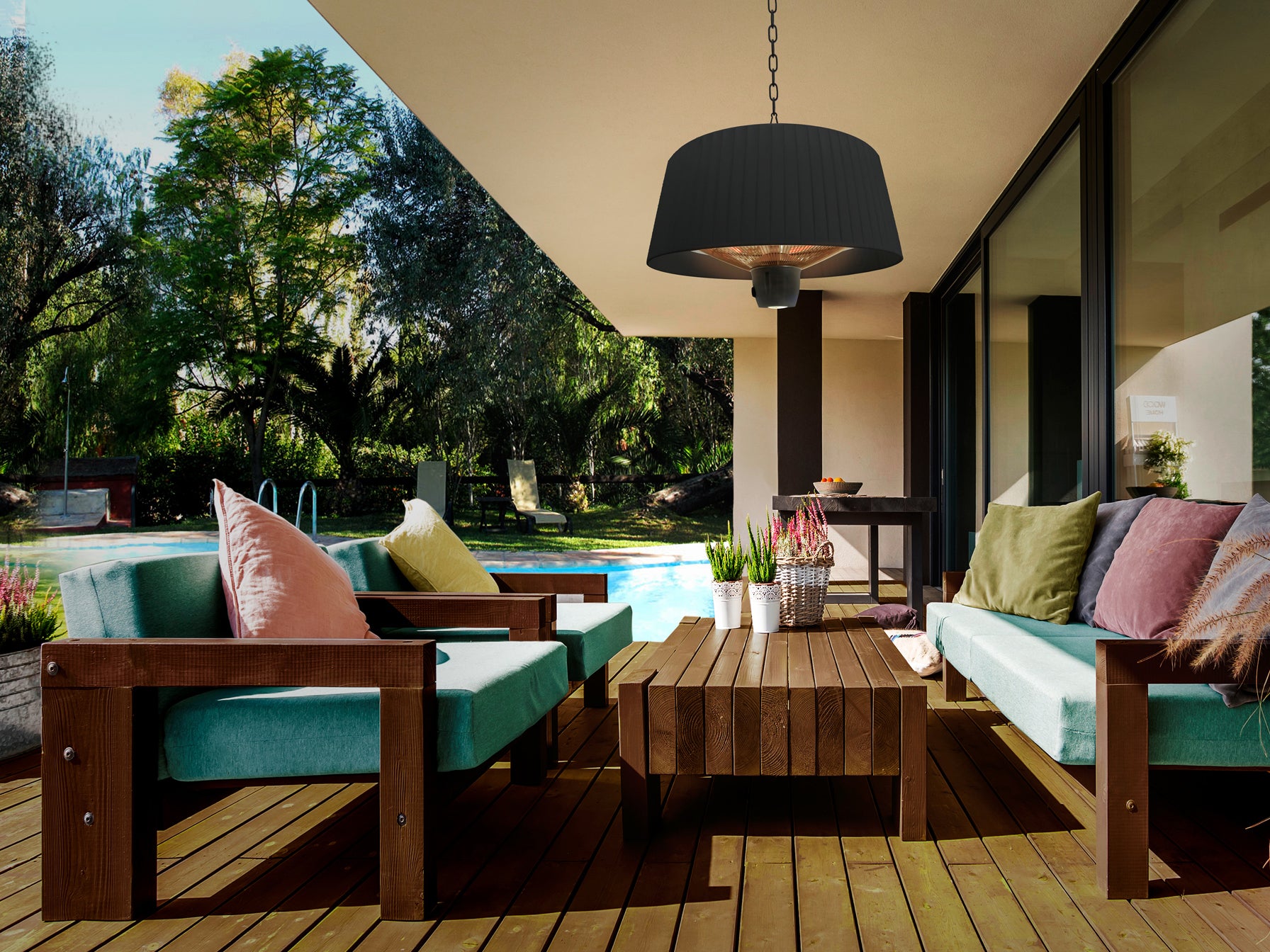 Electric heater for ceiling installation, suspension style. Made of metal and plastic in a black finish, with a black pleated textile shade. Provides halogen heating at 600/900/1500W and includes a 1W LED light. Operated by remote control. Cable length: 1.8 m. Rated IP44.
