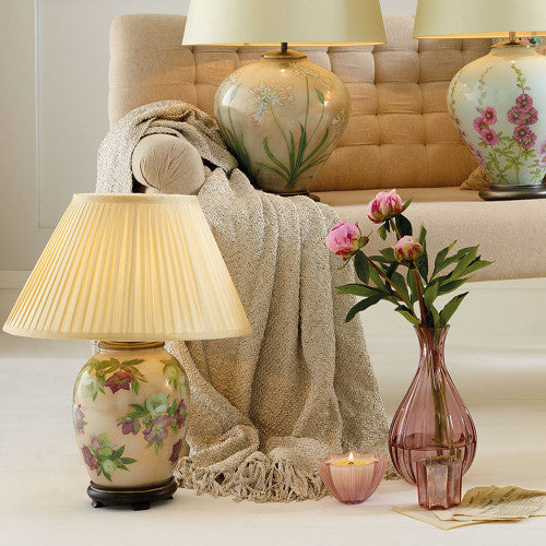 The Hellebore design is pictured on a cream champagne colour background with a dark fuschia and white flower. The gold accenting gives the design depth and is synonymous with the Jenny Worrall brand. The glass is then completed with an antique brass finish base and top and a B22 light bulb holder in the same finish.