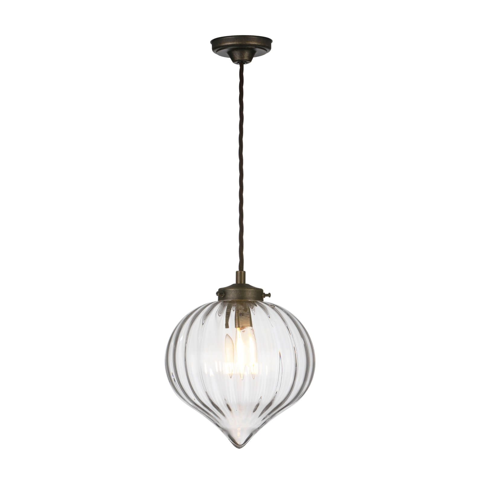 The Holborn pendant features a ridged teardrop glass on a classic antique brass suspension with traditional brown braided cable. Perfect for kitchens and hallways the Holborn both versatile and classic.