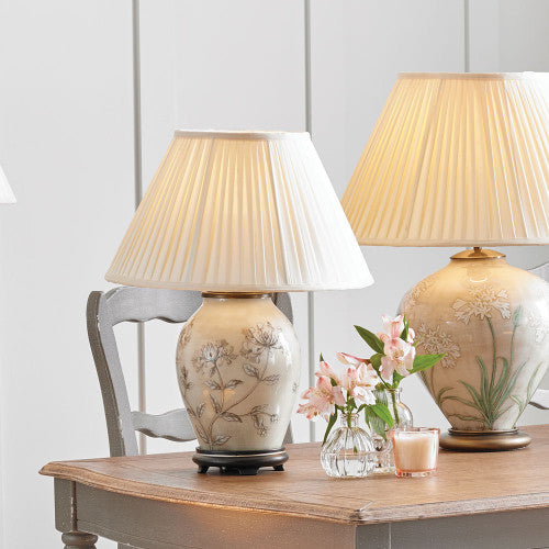 The iconic Jenny Worrall brand boasts a range of truly exquisite table lamp designs. Created using the traditional technique of potichomania, delicate decals are applied by hand within the base of the lamp. Each lamp design is then carefully built up with layers of hand-sponged lustre and colour to create the finished effect. Style with either a 35cm diameter cylinder lampshade or if you choose a very tapered style shade we would recommend using up to 40cm diameter.