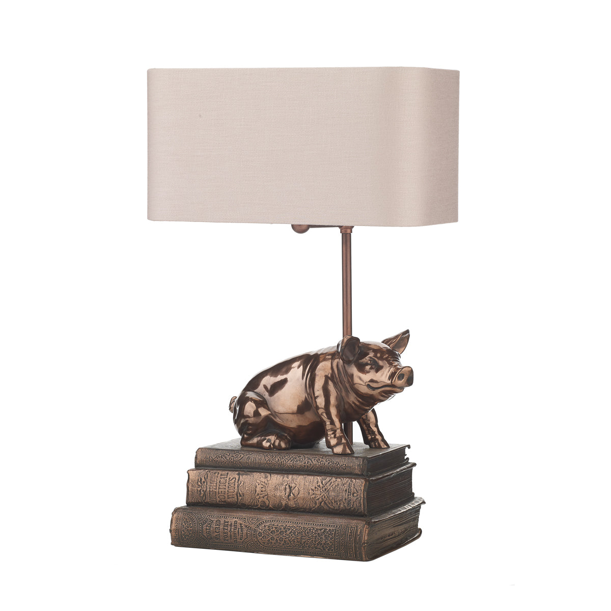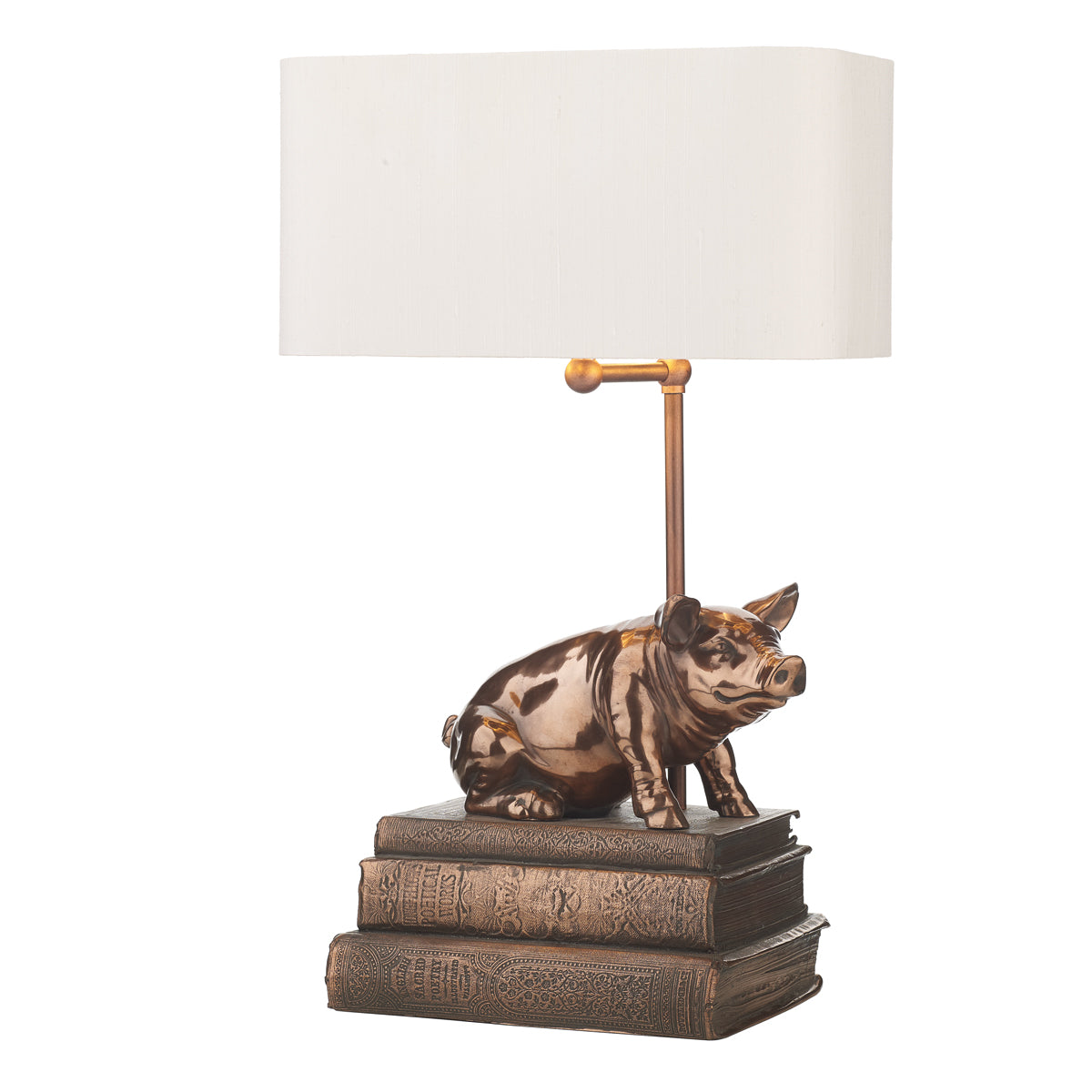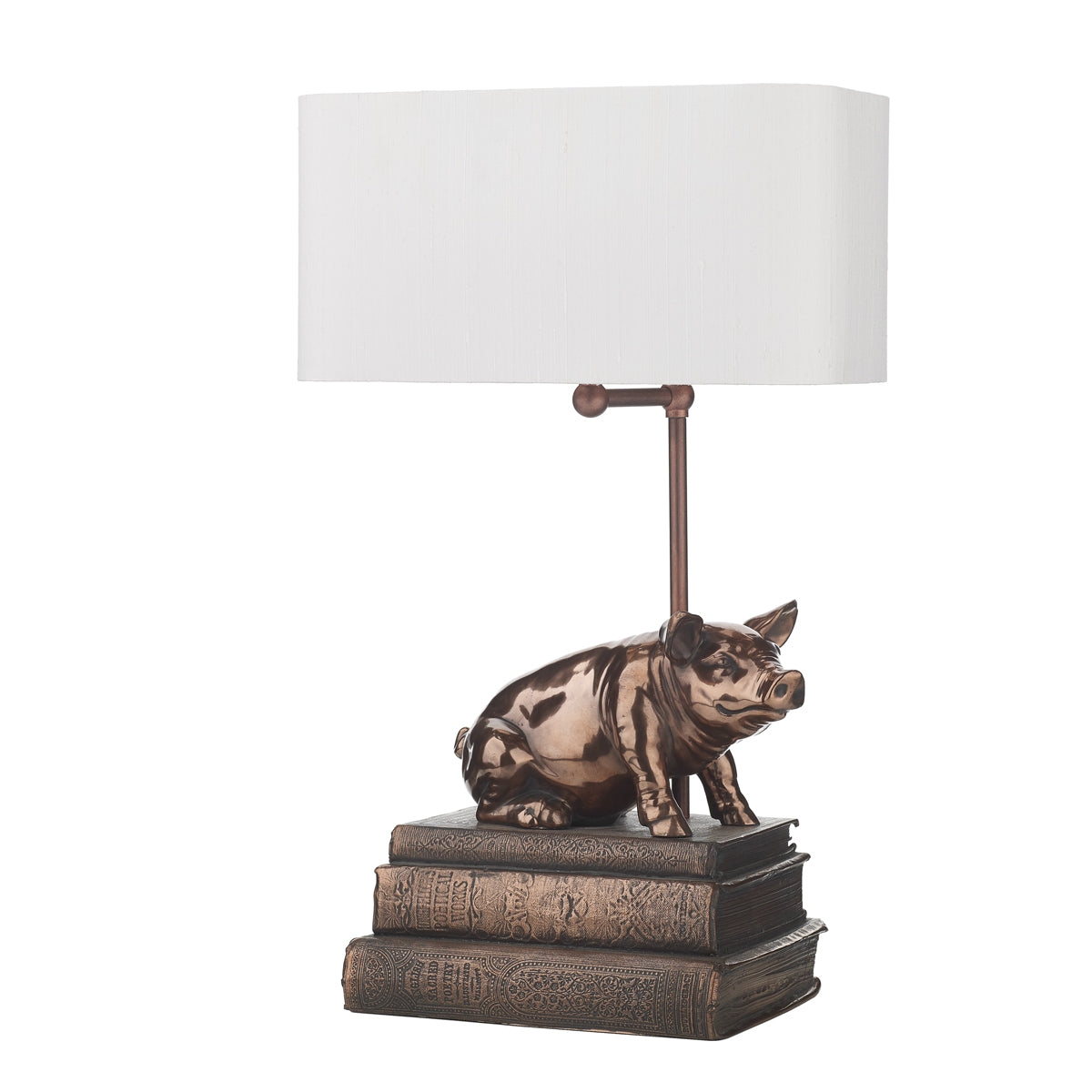 Our Horace table lamp featuring a charming pig, in our copper resin finish and coordinating braided cable. Shown with optional Zoffany shade, available to purchase separately.Shown with our Zoffanyshade, available to purchase separately. Our bespoke Zoffany lamp shadesaremanufactured by our sister brand The Light Shade Studio .Shadesareavailable to order from our extensive palette of luxurioussilk dupions, silk linens and smooth satin fabrics, with a choice of white laminate, lavishgold, cool silver and warm bronze metallic linings.Our complete fabric swatch palette is now available to order.We recommend the use of a LED Classic GLS Lamp (see BUL/B22/LED/4 ) with this table lamp, to be ordered separately.