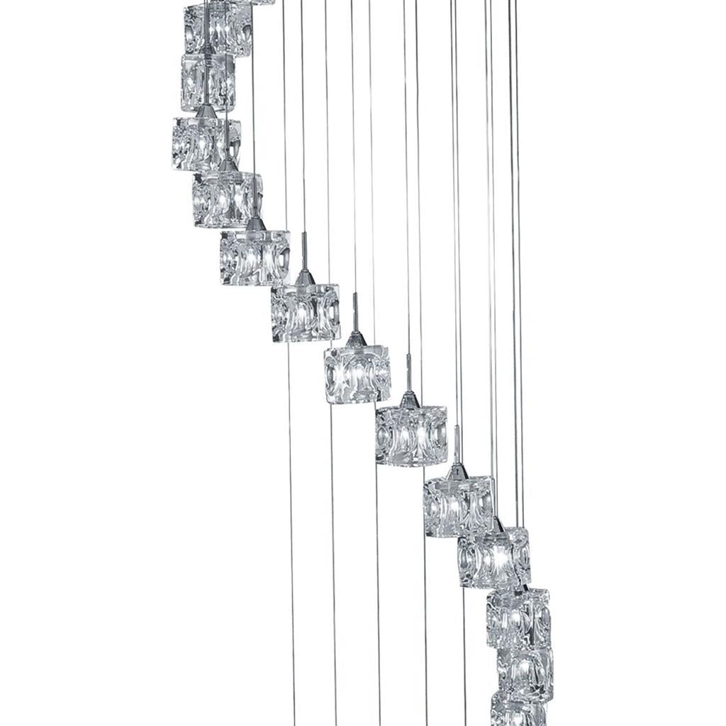 Bring an exciting modern edge to any home with the exquisite Ice Cube multi-drop pendant that will look fantastic above a stairwell or within any entrance hall. The pendant stands at 3m total height and from this, 20 LED lights drape in a stylish manner from a chrome ring attached to many mild steel cords. The ice cube glass shades have a textured slight dimpled effect to create the effect of an ice cube. LED's use up to 75% less energy and last up to 20 times longer than incandescent bulbs.