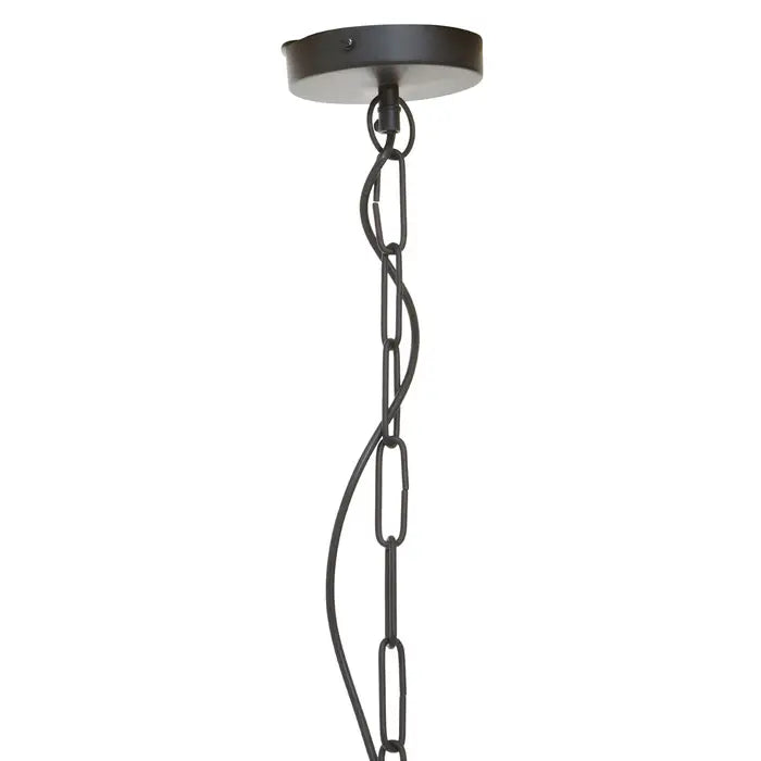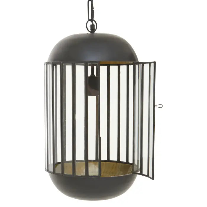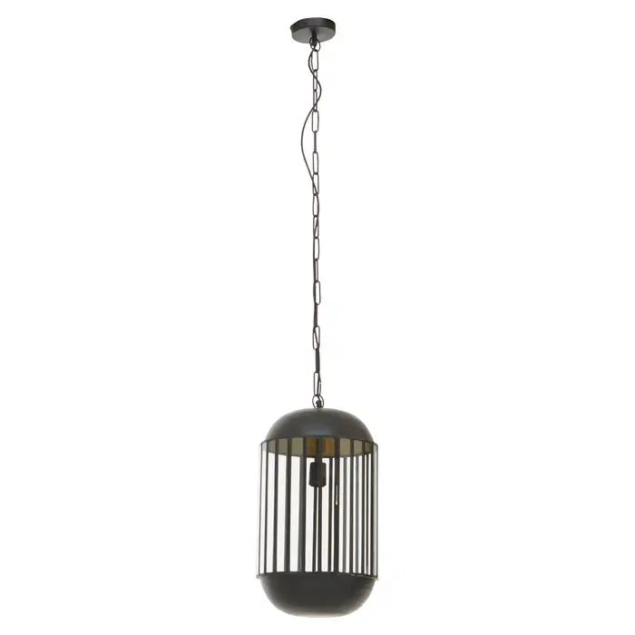 This pendant light exhibits a caged framework and exudes an interplay of light and dark hues across the living area.