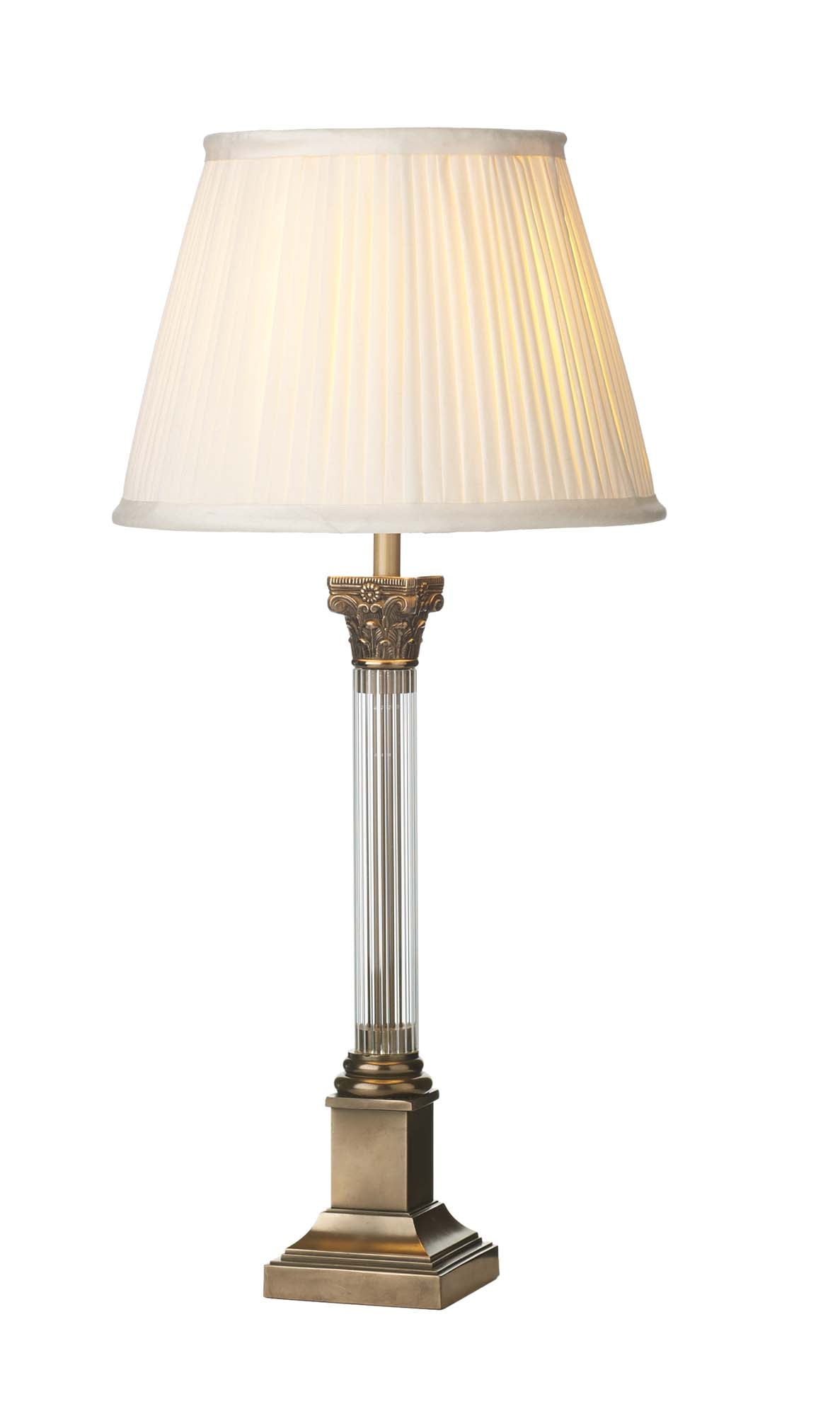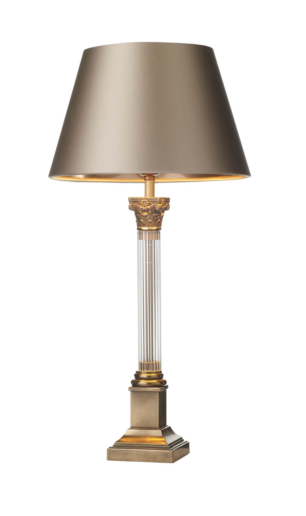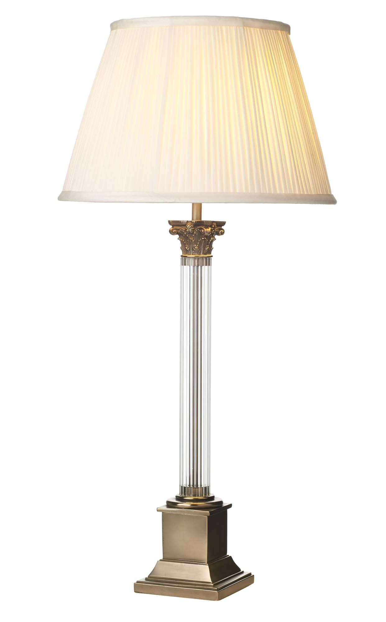 A classic and imposing table lamp with a single reeded column of ribbed glass, finished with polished bronze resin detailing in the Corinthian style.Shade sold separately. Shades Shown EMP25 in Almond Cream satin and Black silk dupion and the pleated Ivory TRI2515We recommend the use of 1 x BUL-B22-LED-4 bulb for this table lamp, to be ordered separately.