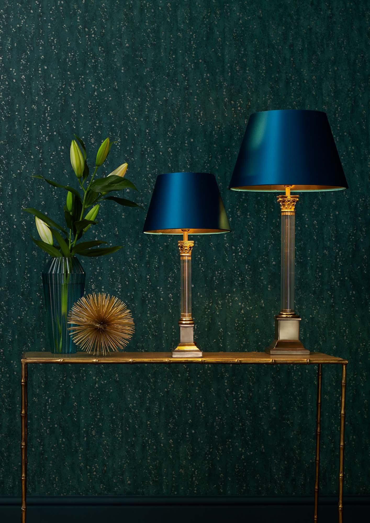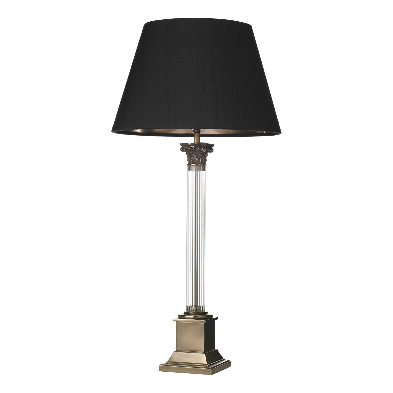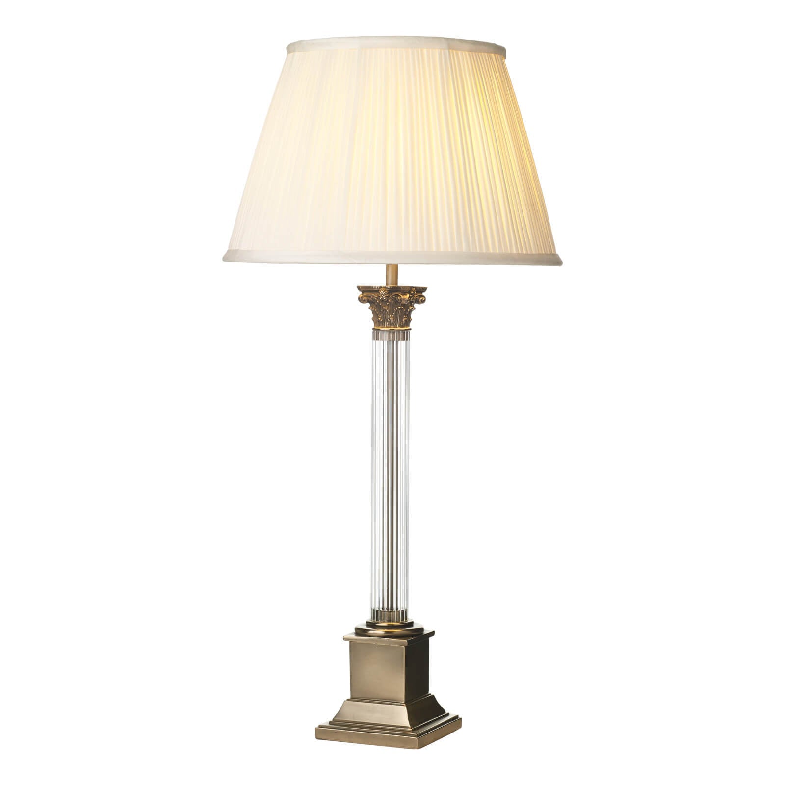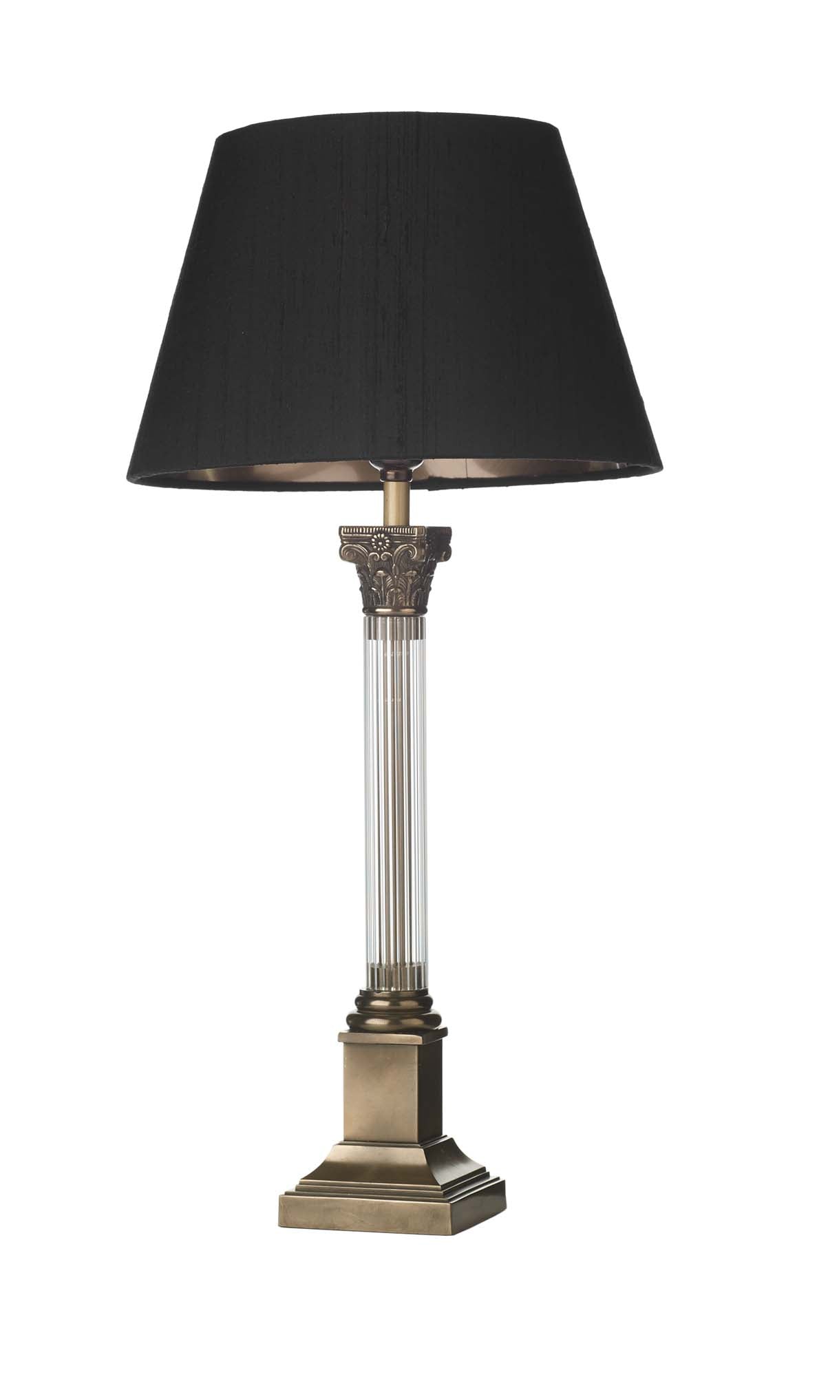 A classic and imposing table lamp with a single reeded column of ribbed glass, finished with polished bronze resin detailing in the Corinthian style.Shade sold separately. Shades Shown EMP25 in Almond Cream satin and Black silk dupion and the pleated Ivory TRI2515We recommend the use of 1 x BUL-B22-LED-4 bulb for this table lamp, to be ordered separately.
