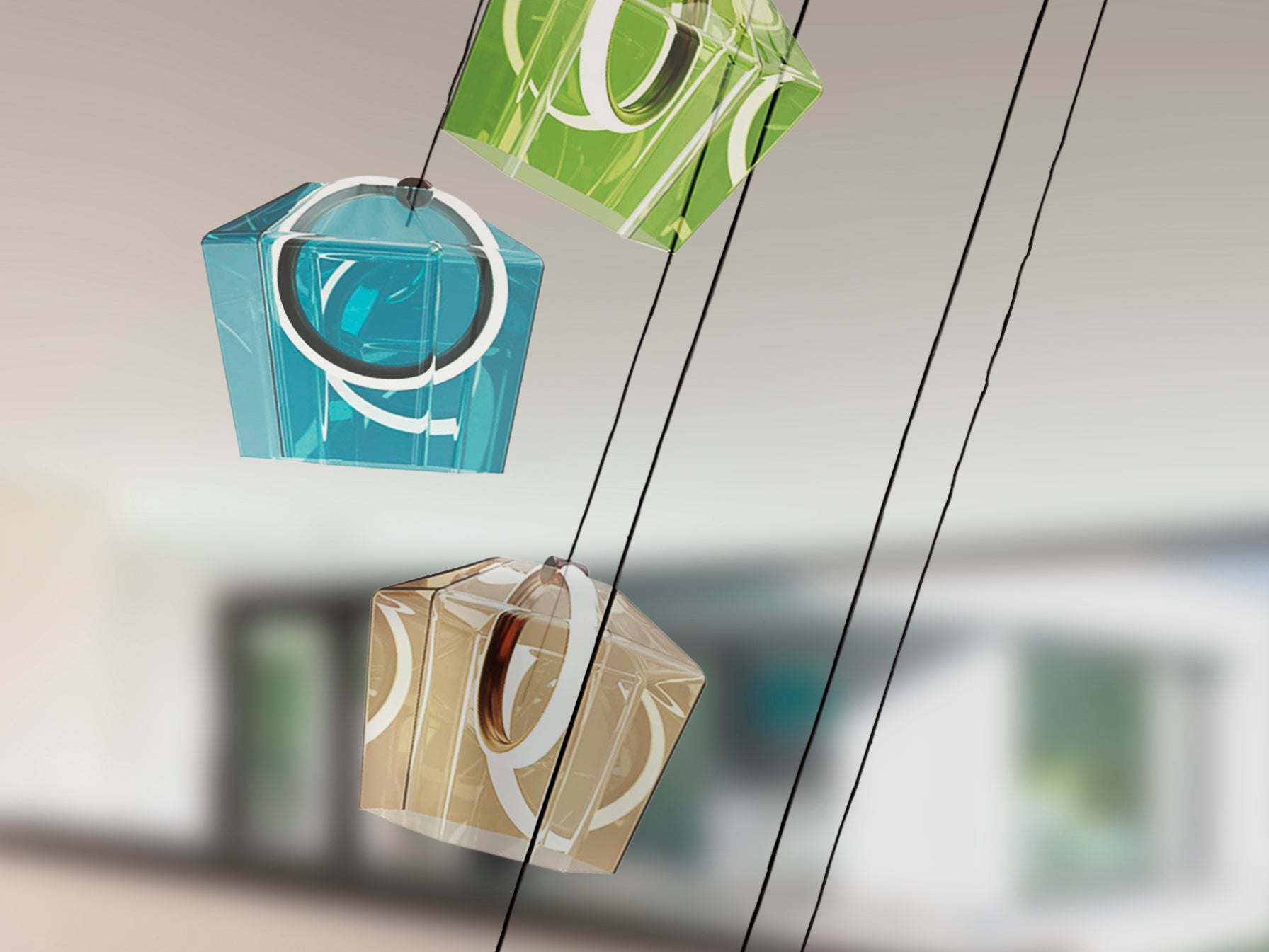 Lamp of 6 lights, made of brushed aluminium finished in a dark bronze tone. Features tinted glass shades in champagne, green, blue, grey, and amber tonalities, each with an inner LED light ring and silicone diffuser. Equipped with 36W LED, 966 lm at 3000K.