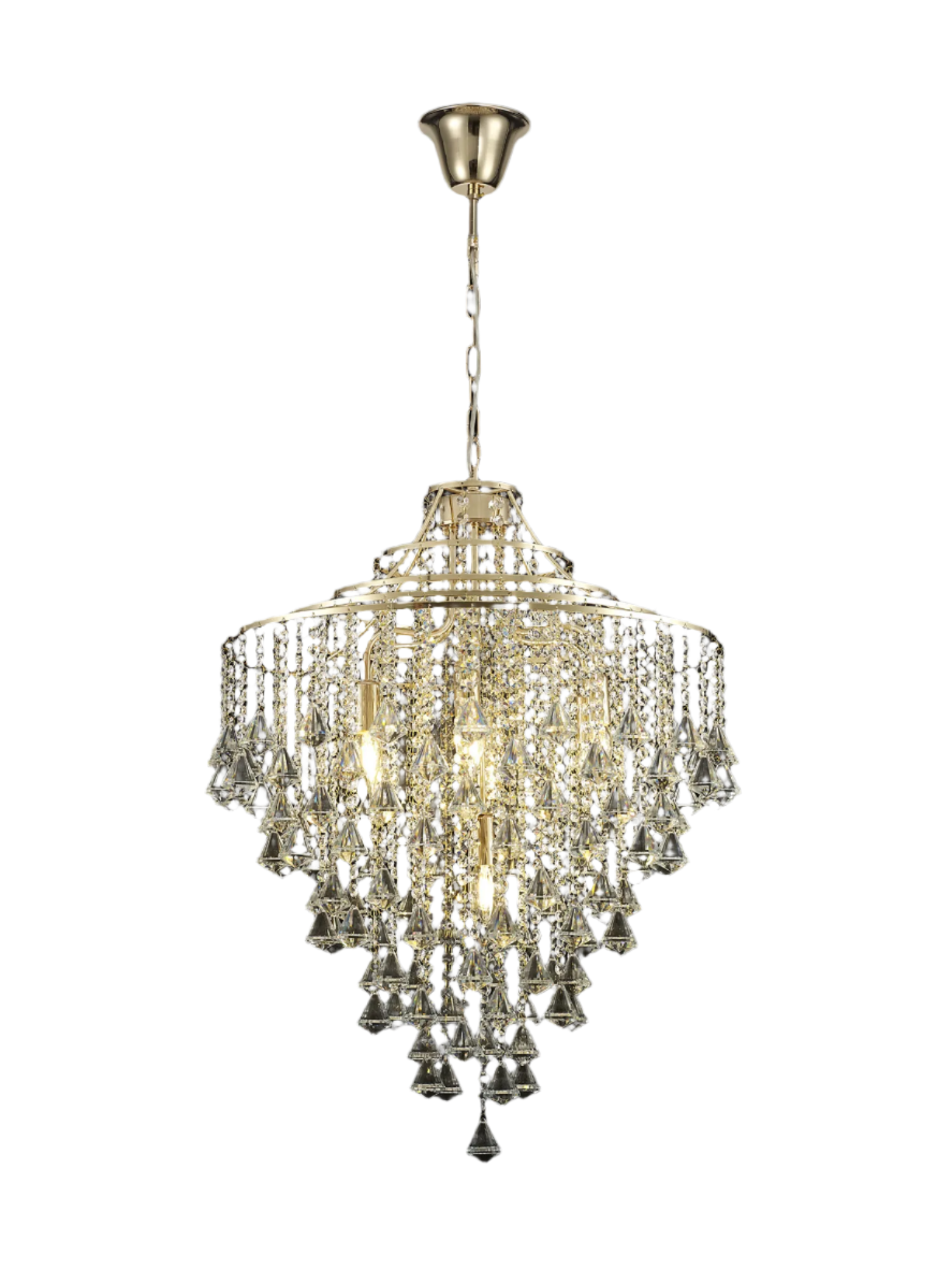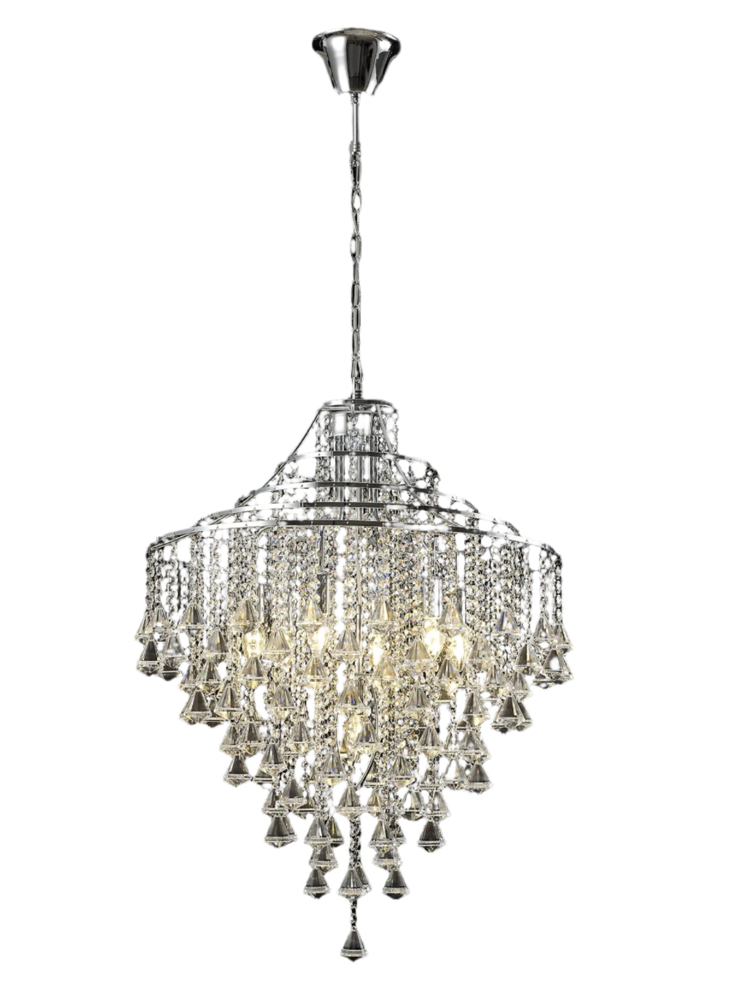 A flagship range of fittings that are dressed with an excessive amount of high quality crystal. Suspended from a Polished Chrome or French Gold framework are strands of clear octagon crystals supporting a larger clear crystal prism. The sheer quantity of crystal faces within any of the Inina fixtures, create an immense amount of sparkle and spectral colour.