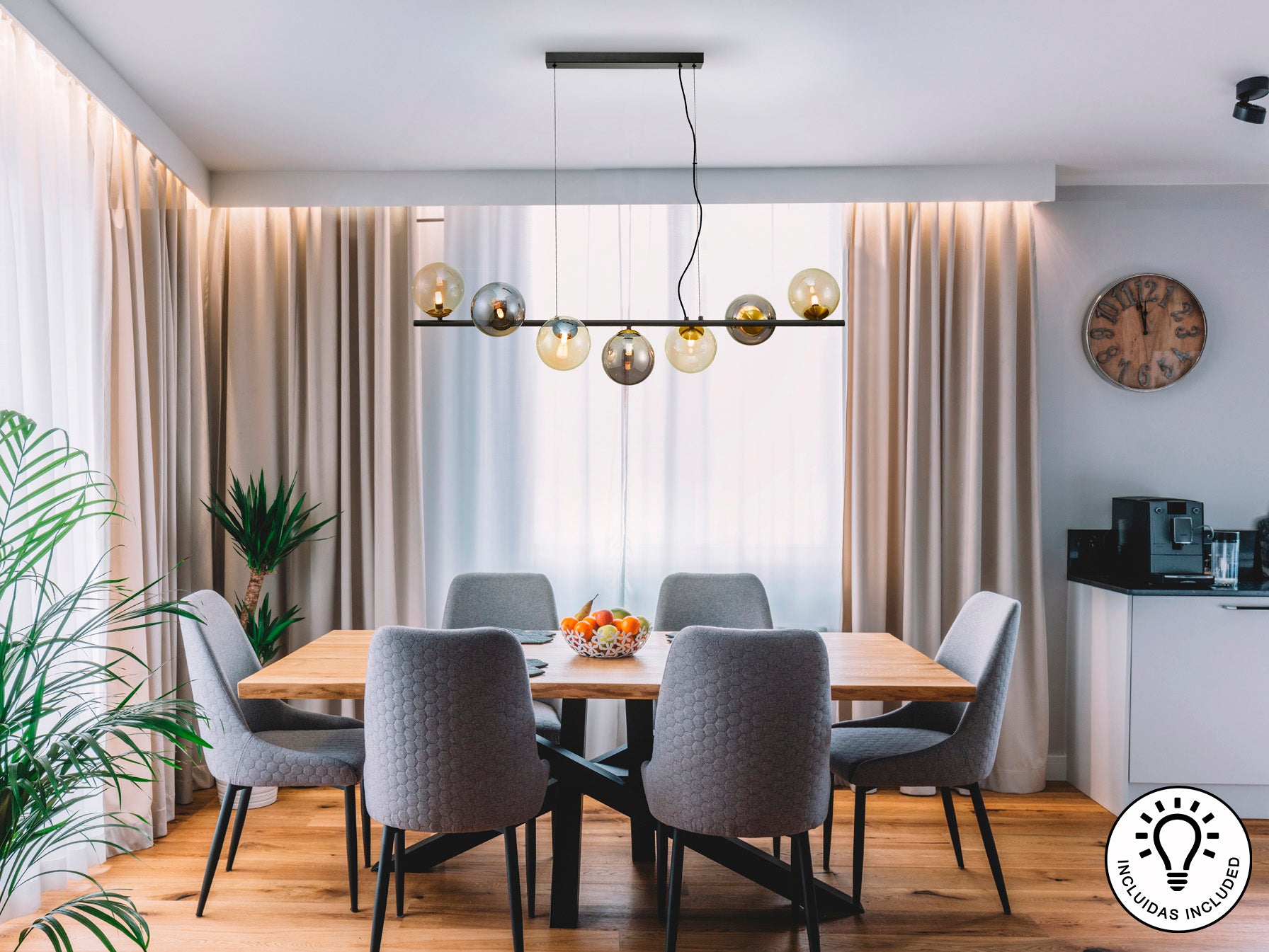 Lamp made of metal in matt black with satin brass details. Features spherical glass shades in amber and shimmered smoke grey. Adjustable in length. This item includes 7 × G9 LED 4W. This lamp is supplied with GRAVITY TOGGLES to improve ceiling fixing. 110v version available.