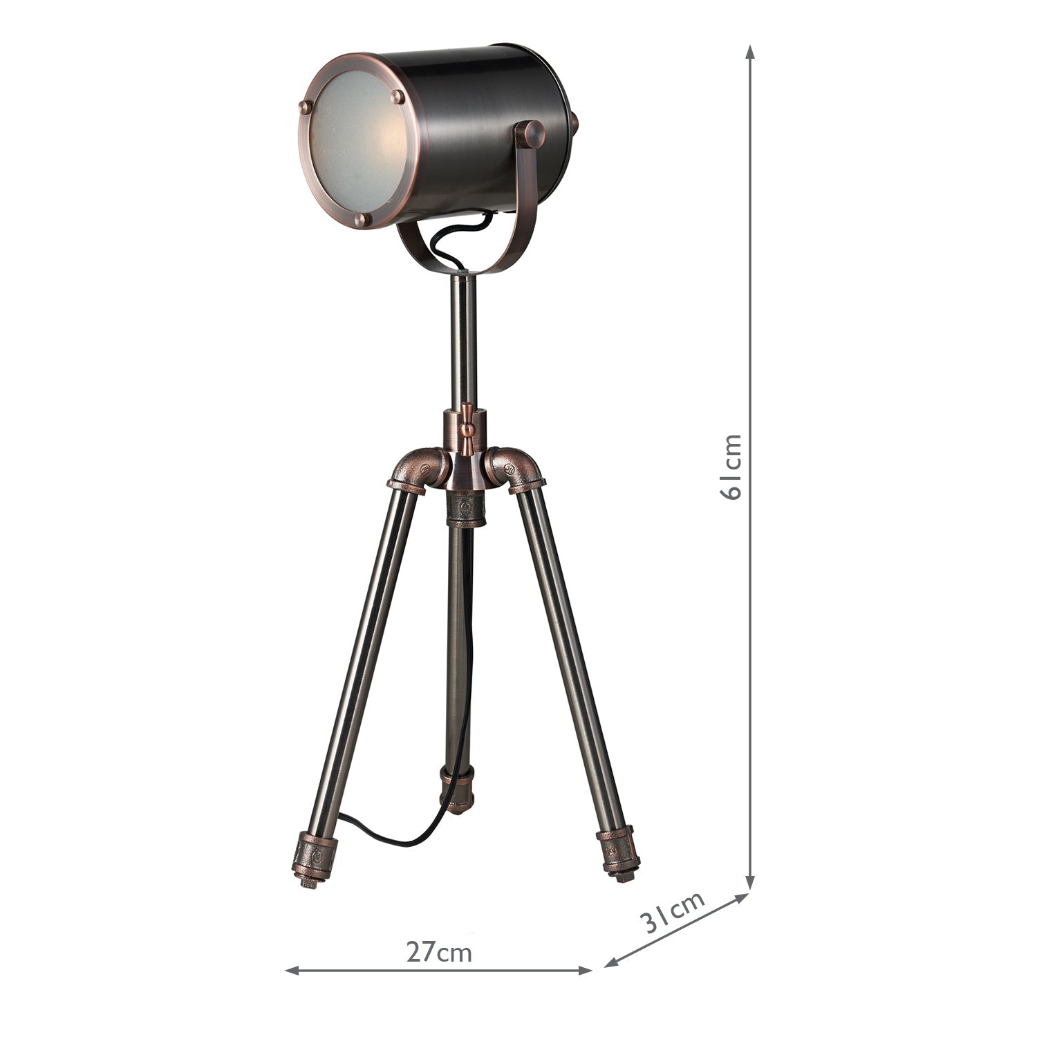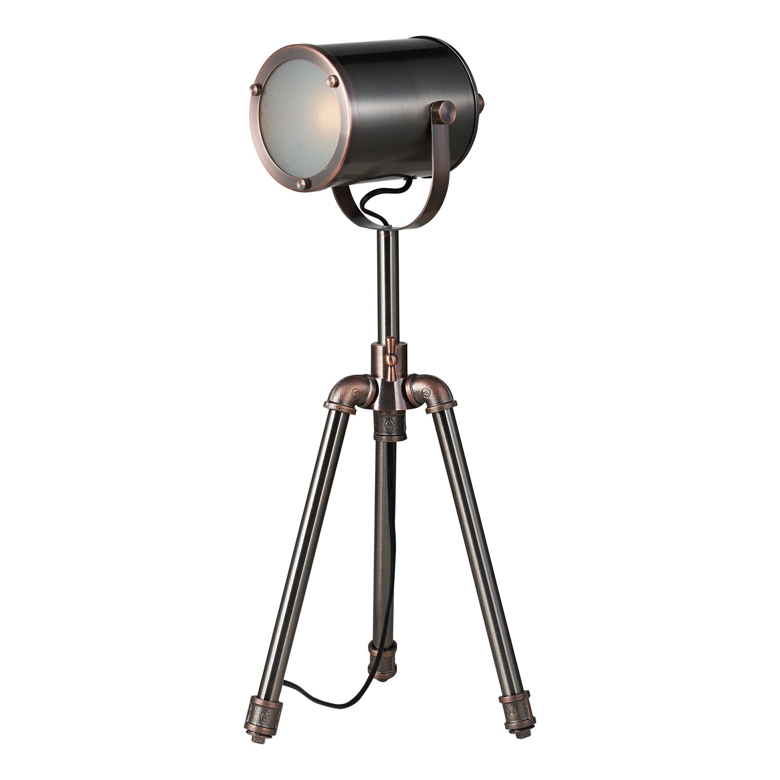 The JAKE Table Lamp is finished in antique silver and copper with a tripod style base featuring authentic pipe detailing giving this table lamp a vintage industrial feel. The head evokes the mid-century studio lights and is adjustable. With its distinctive styling this is great way to enhance the character and period feel in any room. It has an adjustable height head. It has a black cable with a convenient in line switch to save having to reach down for the plug to operate the table lamp.The JAKE Table Lamp makes a statement and sits well in the kitchen, living room, hallway, or dining room where it can complement the interior style. The studio light style make it a good choice for adding a reading light beside a chair or to shine light to illuminate a feature corner or space.