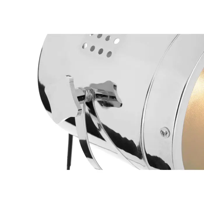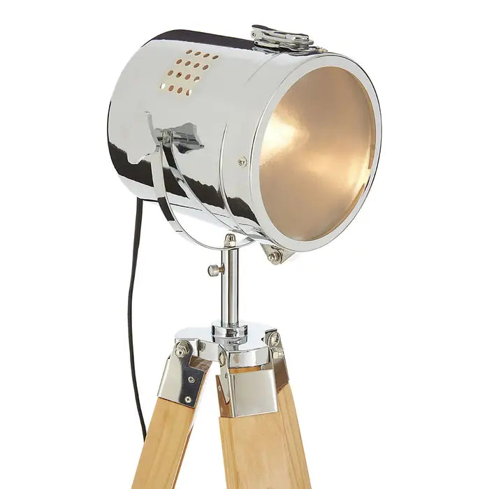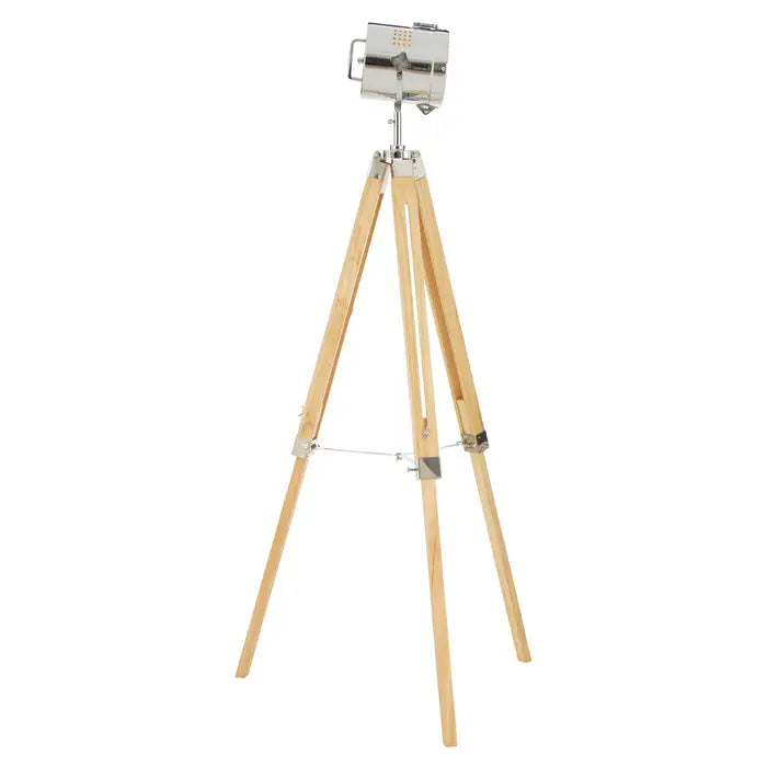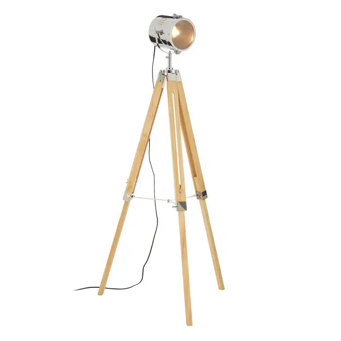 The Jasper floor lamp's sleek design features a natural wood tripod base supporting a stylish, industrial-inspired spotlight.