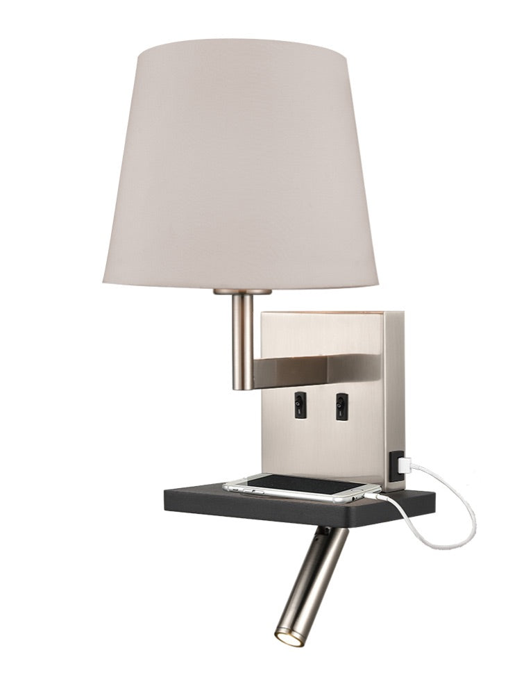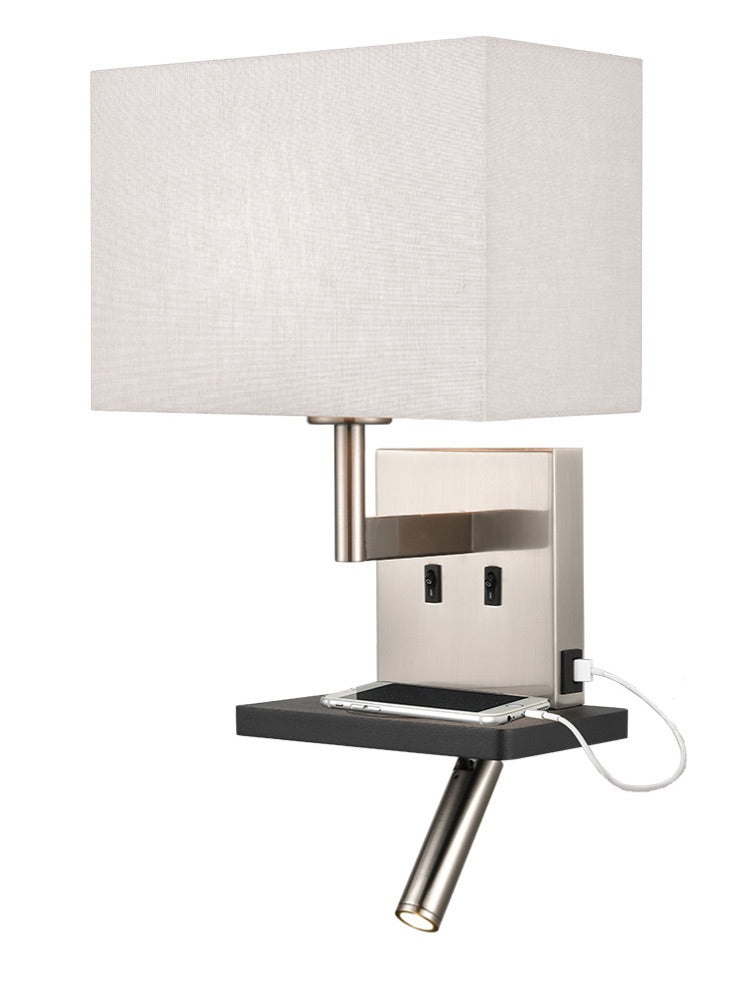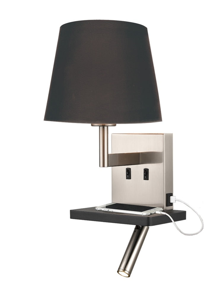 In satin nickel and matt black finish with an LED reading light, 2 switches on the backplate, a USB port and device pad with wireless charging point. Shown with a taupe tapered shade.