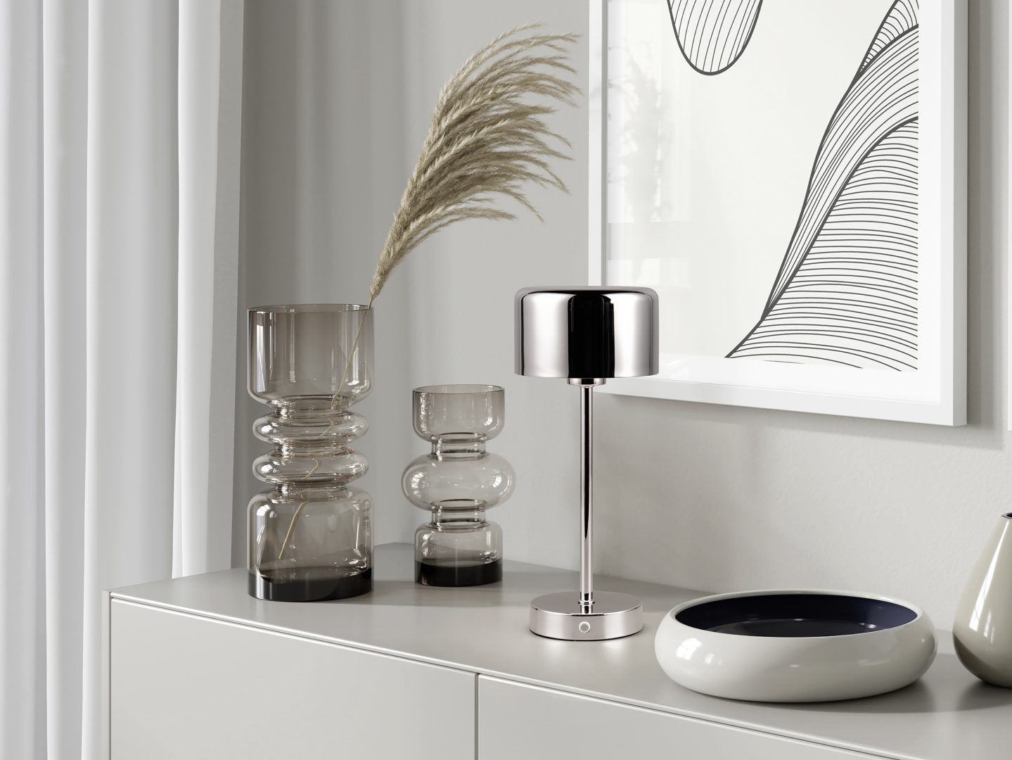 Whether as a charming table lamp or stylish lighting in the bedroom - the cordless rechargeable lamp JEFF is versatile and flexible in use and fulfils a wide range of requirements for mobile and mains-independent lighting indoors. Thanks to its modern and timeless design, the light blends into almost any ambience. In addition to its attractive appearance, the luminaire has a 3-step touch dimmer and provides up to 12 hours of glare-free light. The metal design in chrome is modern and stylishly enhances your interior. The luminaire also features modern LED technology, which is characterised by high light quality and energy efficiency. Compared to conventional halogen light sources, up to 80% of energy costs can be saved. LED light sources also have a long service life, produce less heat and protect the environment.