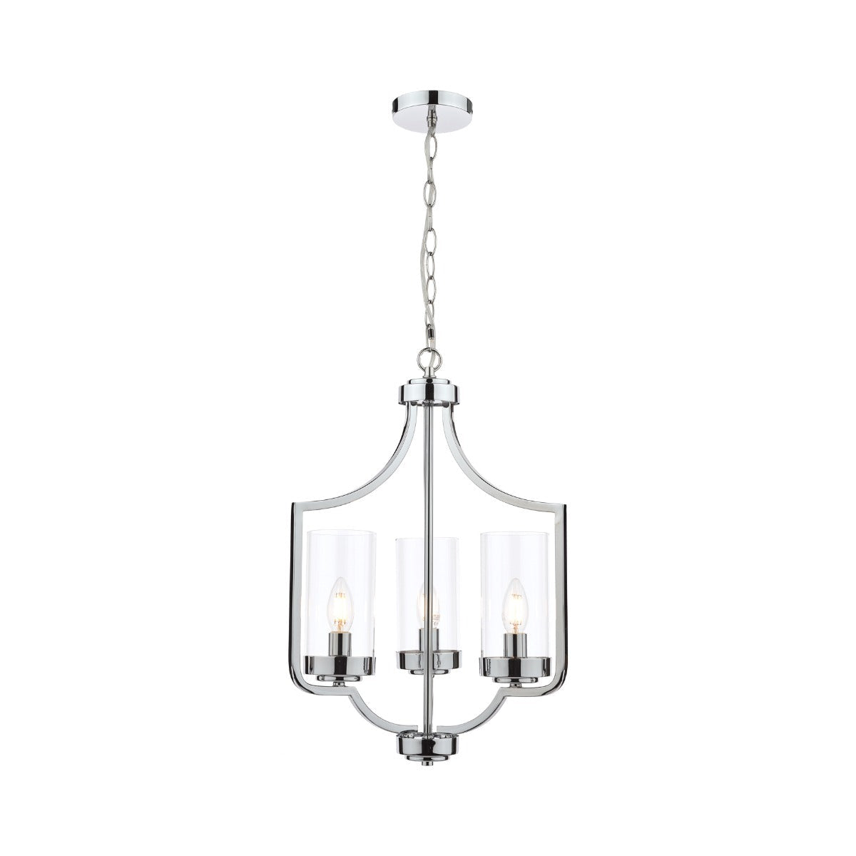 The Joseph Chandelier from Laura Ashley was inspired by the draped form of a Moroccan tent. This unusual chandelier has three individual lampholders, each supporting a clear glass cylinder shade, held on arms that continue upwards to form an open lantern-style framework. It is finished in bright polished chrome.This ceiling pendant fitting has a matching finish ceiling rose and hanging chain plus a discreet clear cable. Shades not needed. Height is adjustable at the point of installation (62–162cm).