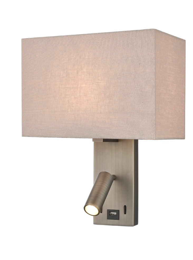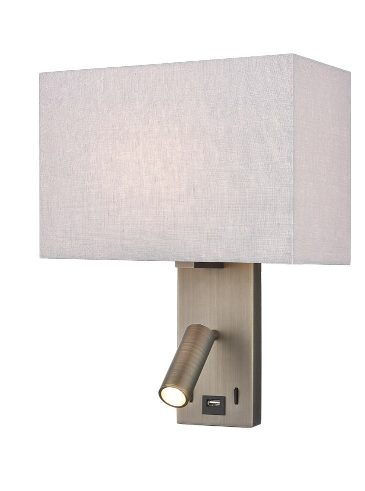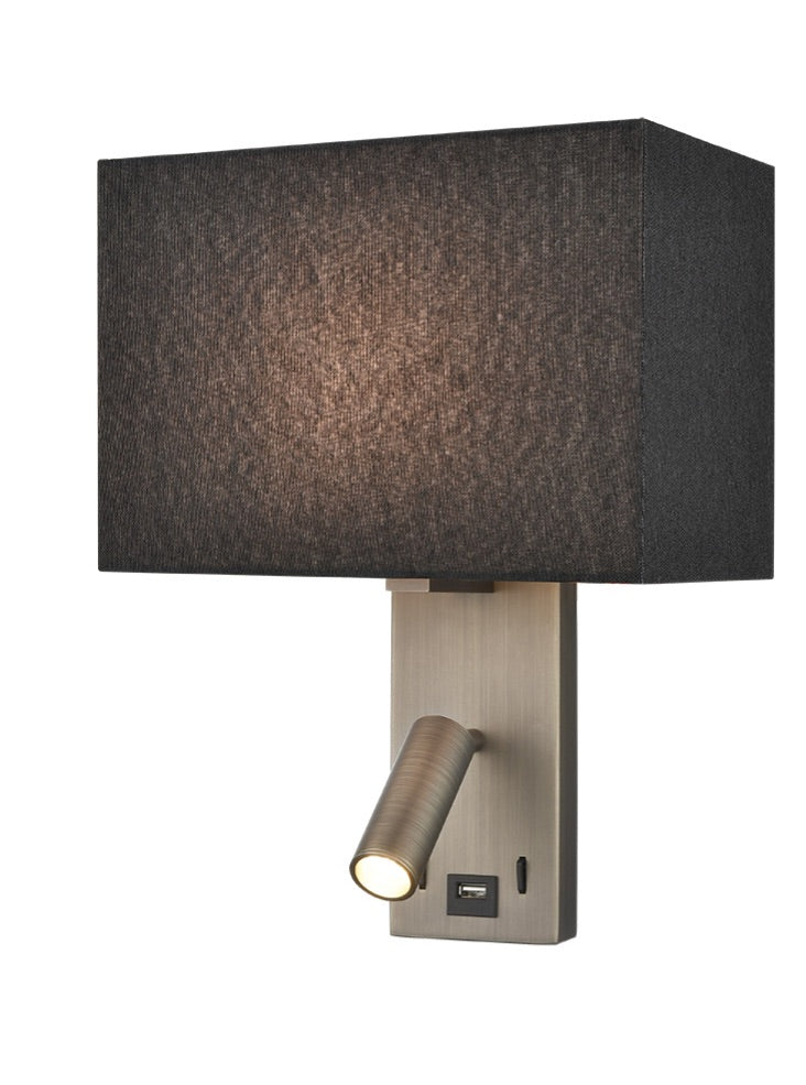 In bronze finish with 2 switches and a USB port on the backplate. Shown with an off white rectangular half shade.