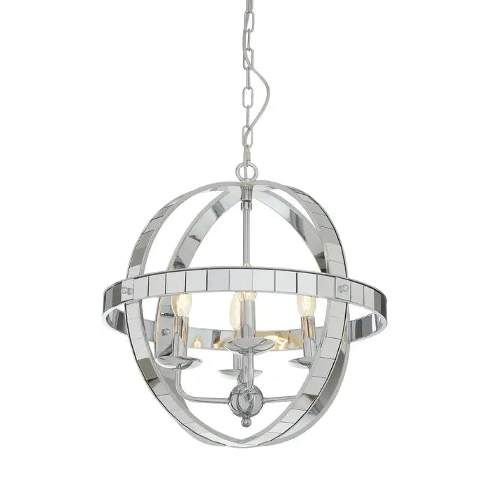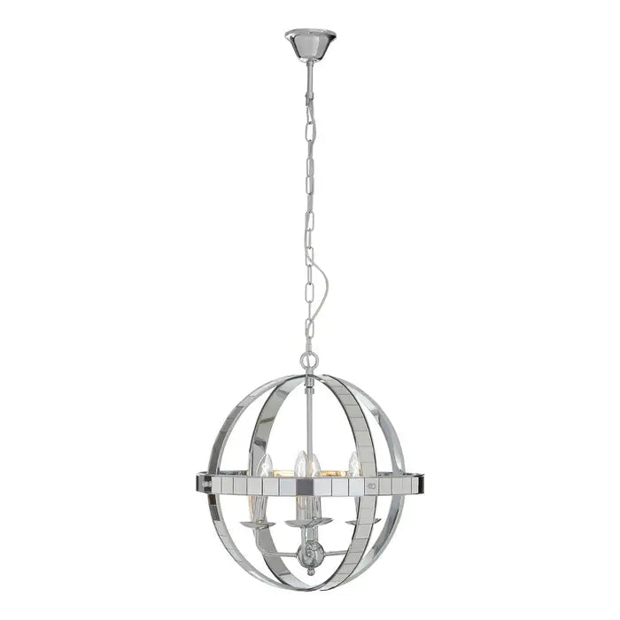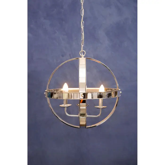 Two intersecting lines of polished tiled iron are fixed to the clear glass orb like gyroscopic gimbals adding a contemporary touch to the Kensington Townhouse rounded pendant light.