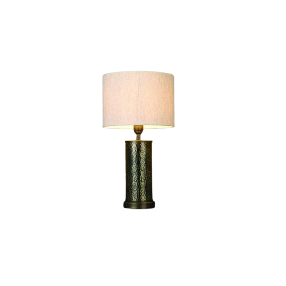 The Kenya table light features a hammered aged bronze effect base, with a natural linen effect shade. A stylish fitting which would suit a variety of styles and settings. Supplied with and inline switch, compatible with LED lamps, matching items available.