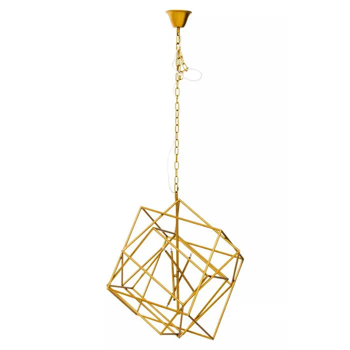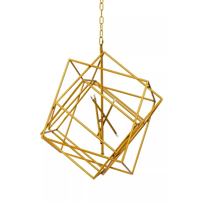 This pendant light features four/six brass finish metal bulb holders in the middle. It has a minimalist profile with sleek and slender metal rods. The structure hangs from a metal canopy with a brass finish chain that gives the light a luxe appearance.