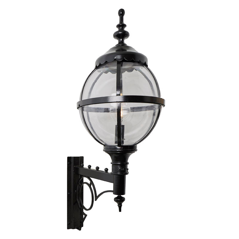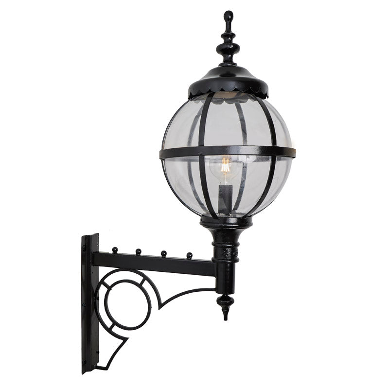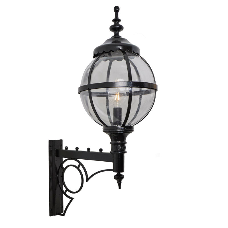Large Victorian style globe wall light in steel 1.47m in height with decorative arm The design for the Heritage range of lighting has been taken directly from a Victorian original lamp post with a cast iron globe. This classic and unique design will add instant style and vibrancy to any outdoor area, the vintage globe and cast iron embellishments are also very versatile with many classical style properties.