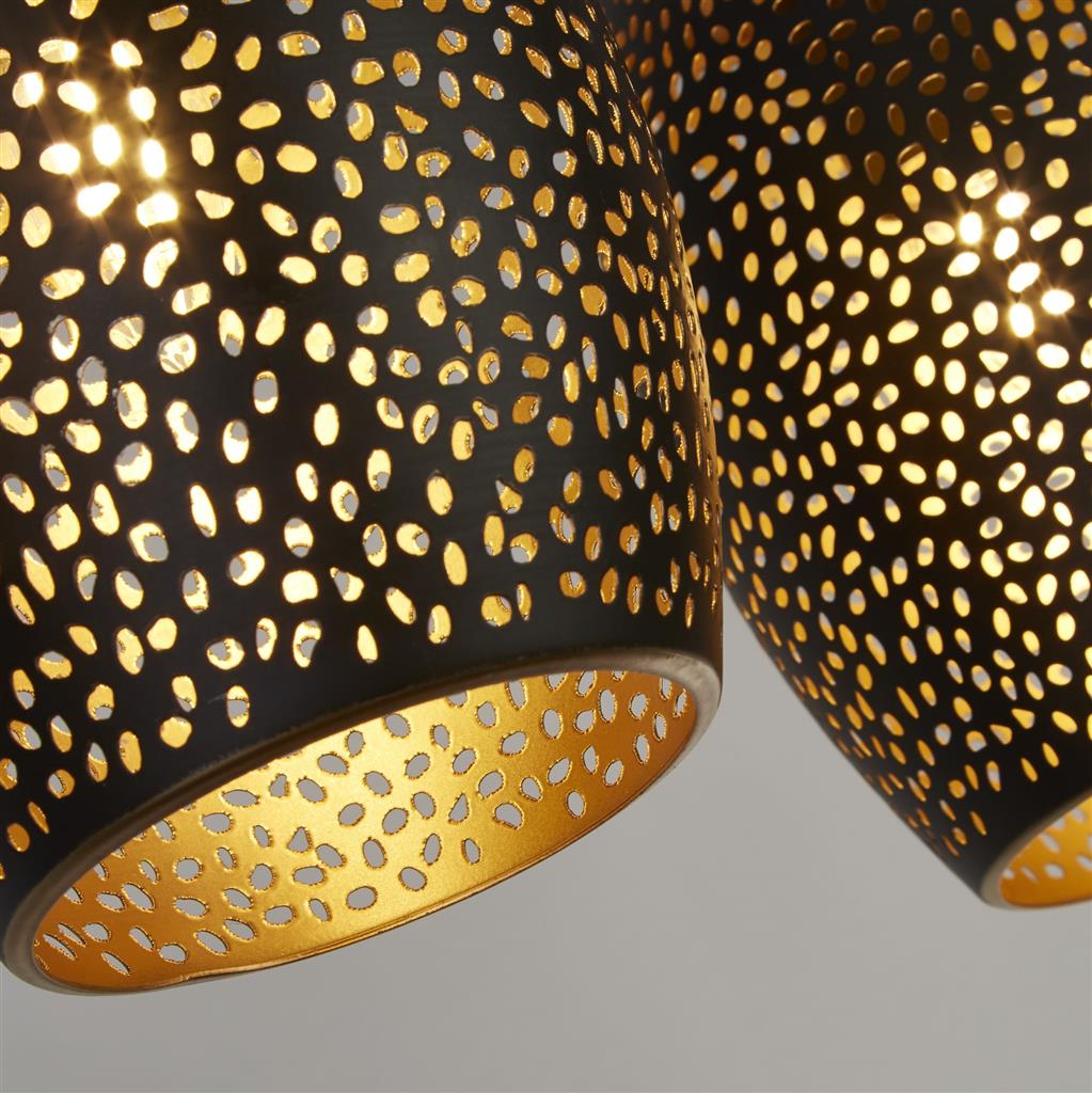 The stunning Laser ceiling bar pendant will add not only a statement to any room, but the laser cut nature of the shade will mean that beautiful light patterns will be cast around the room. The matt black metal shades have a gold inners creating a beautiful warm glow of light in whatever room this light bar is placed.