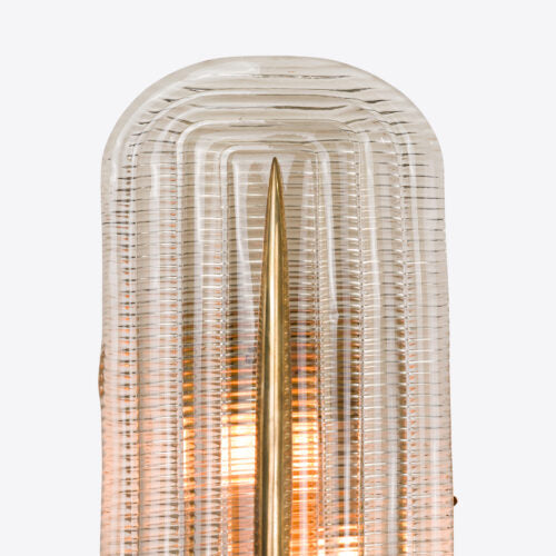 Enhance your space with this stunning wall light, blending midcentury modern design with brutalist influences. Featuring a ribbed glass shade with rounded edges and a bold brass spire accent, this glass shade is designed to sit slightly away from the wall held out on two brass fixings, creating a floating effect that adds depth and dimension to your interior. The textured glass beautifully diffuses light for a warm, ambient glow, while the brass details bring a touch of industrial elegance. Perfect for living rooms, hallways, or bedrooms, this sculptural piece is both functional and a striking focal point for any decor.