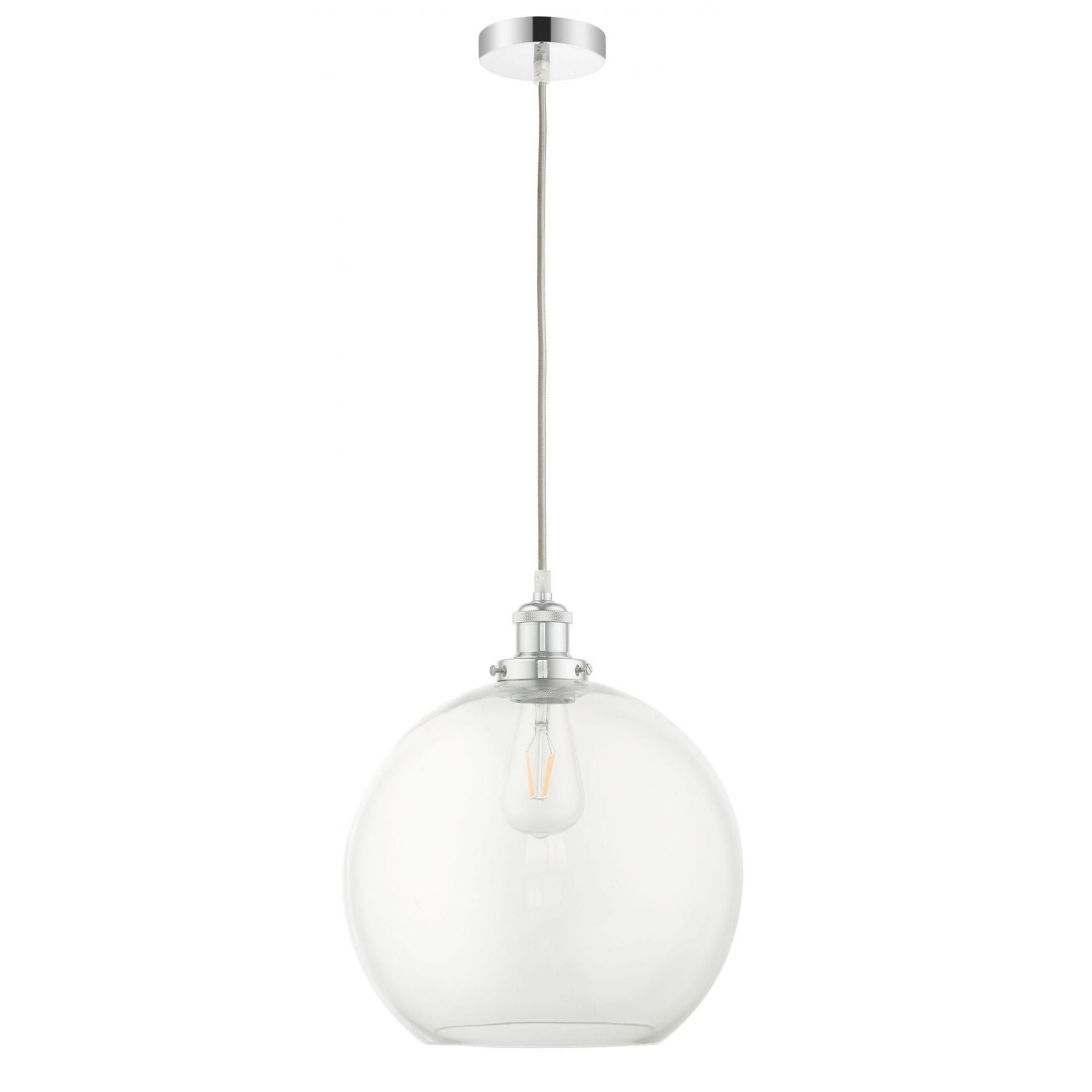 Simplistic spherical shaped clear glass shade with exposed lamp, ideal for hanging over a kitchen island to create the perfect setting. The Lewis has a decorative matching braided flex and exposed screws to give an industrial, vintage styling. 1.5m Flex with this fitting