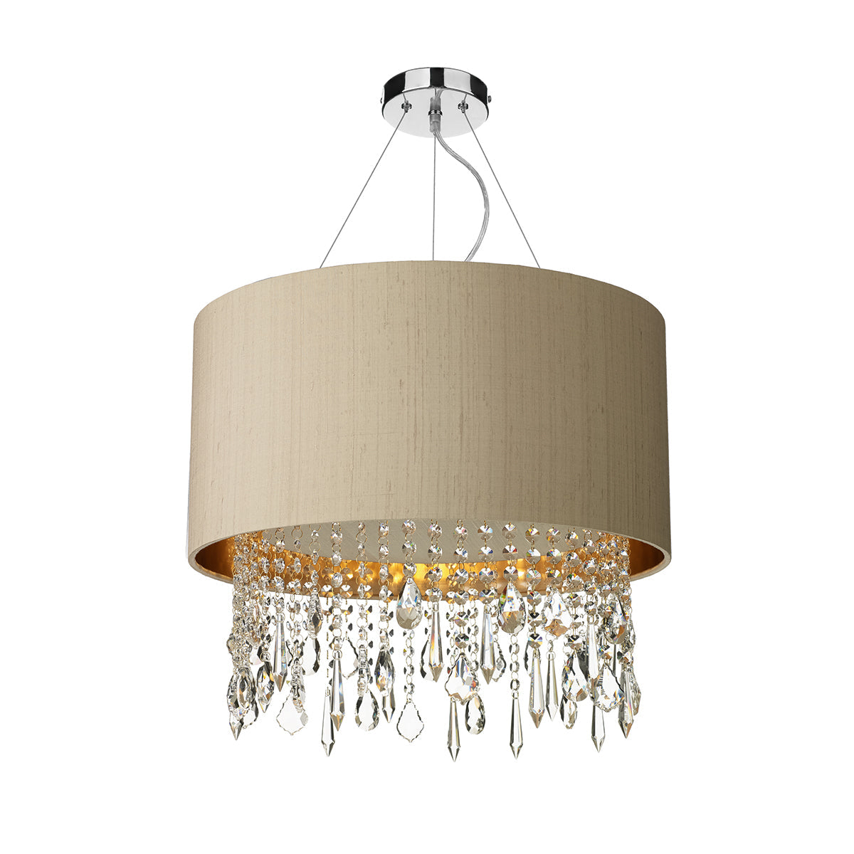 The Lizard combines an elegant drum shade with cut crystal glass decoration to add a touch of glamour to any interior space. The Lizard comes complete with a bespoke fabric shade. Our high quality fabric shades, hand crafted in our Oxfordshire workshop, are fully customisable, with a choice of luxurious fabrics and an array of colours.