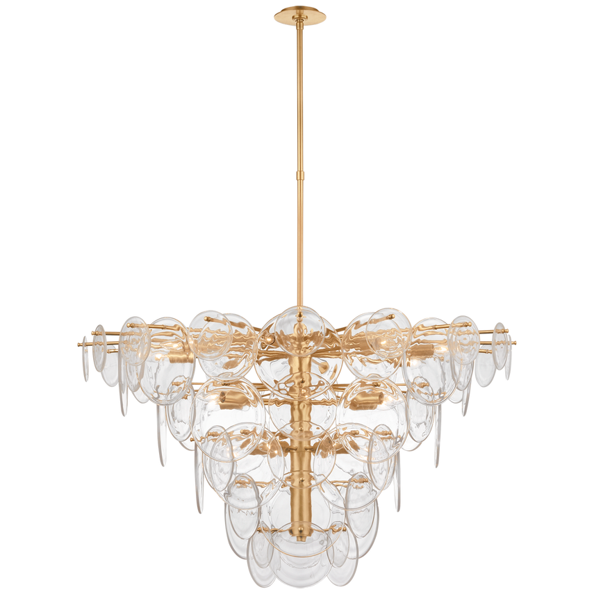 The Loire by AERIN evokes mid-century Italian elegance while adding modern updates in design and finishes. The fluid and dynamic silhouettes cascade and inspire through the distinctive glow of light softly filtered through hand-blown white strié glass discs. Larger pieces can allow a sizeable dining room to be enhanced, or a smaller statement fixture can lend an ethereal quality to more intimate spaces.