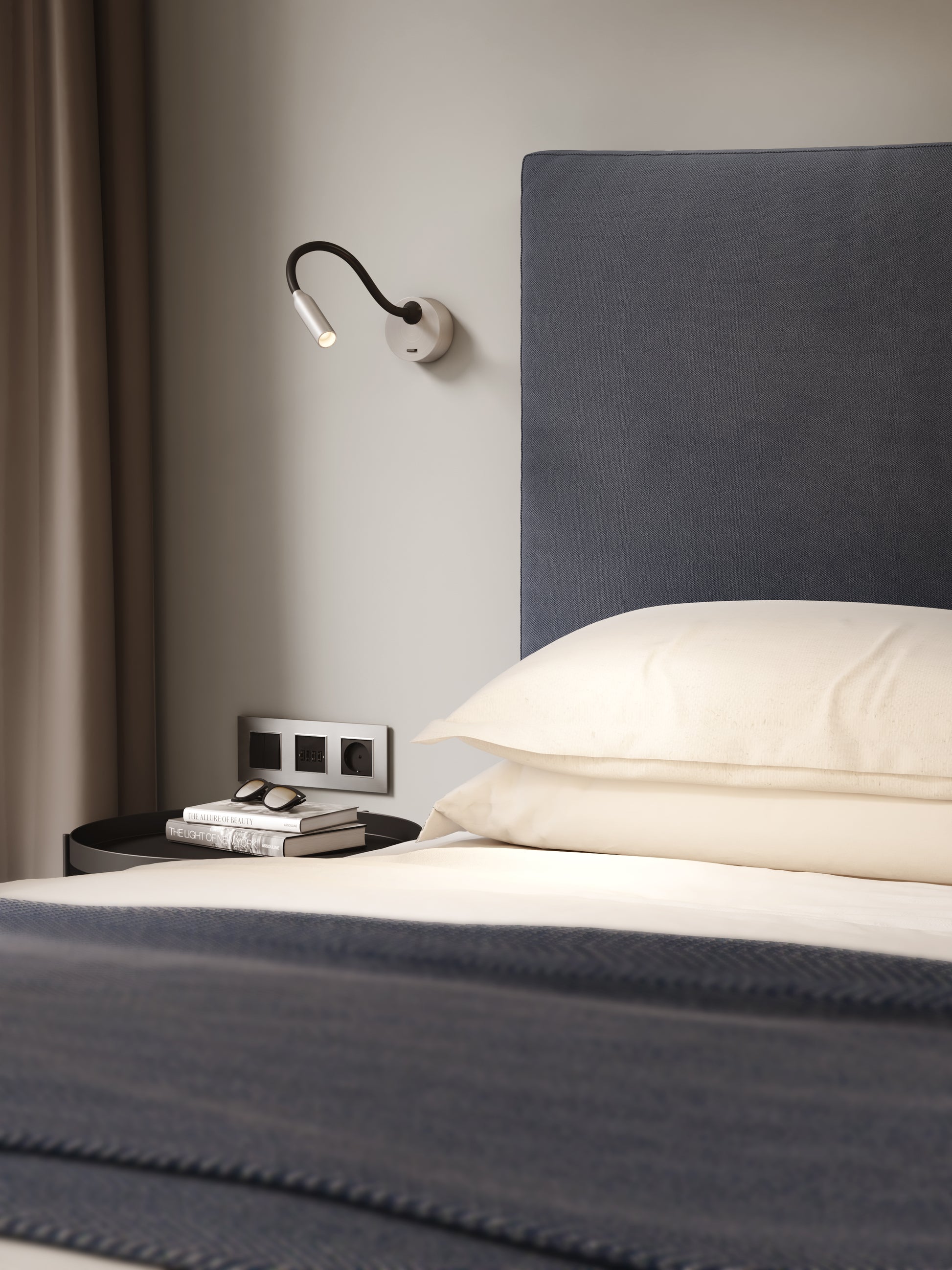The Lucca Surface reading light is a modern update on the classic gooseneck task light, with a flexible matt black silicone arm. Our slimmest LED reader to date, the design’s slender form gives it a visual lightness that belies its extreme practicality. It features a deeply recessed, low-glare LED and matt-black bezel for visual comfort, and comes in a choice of matt black, bronze, matt nickel or matt gold finishes.