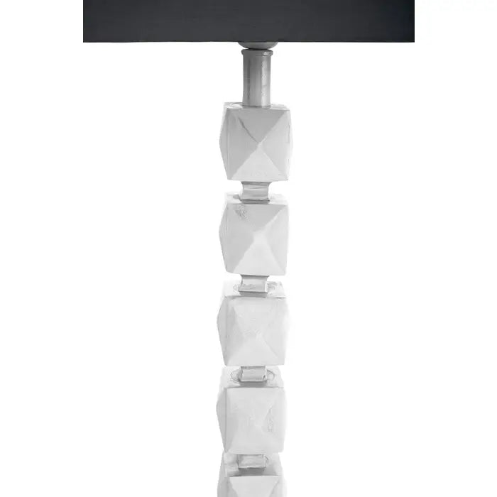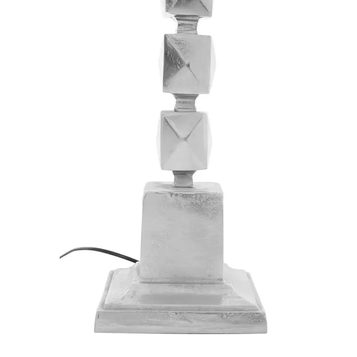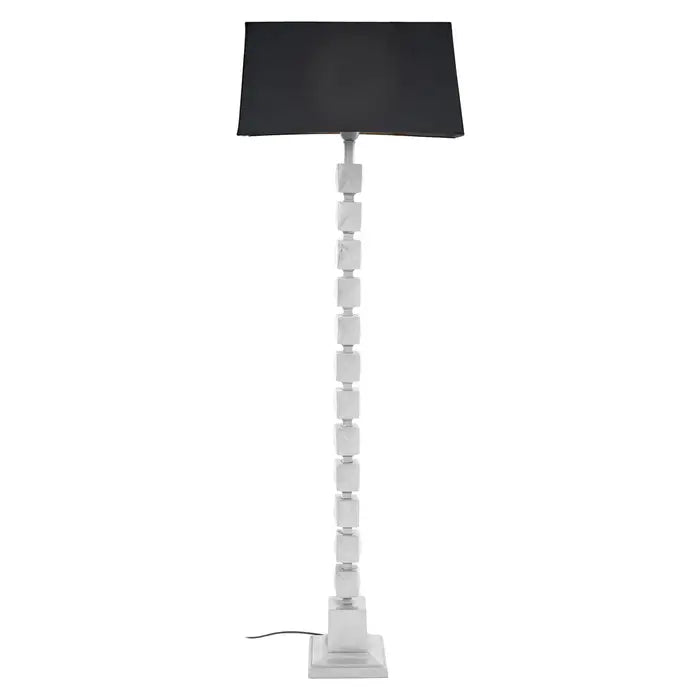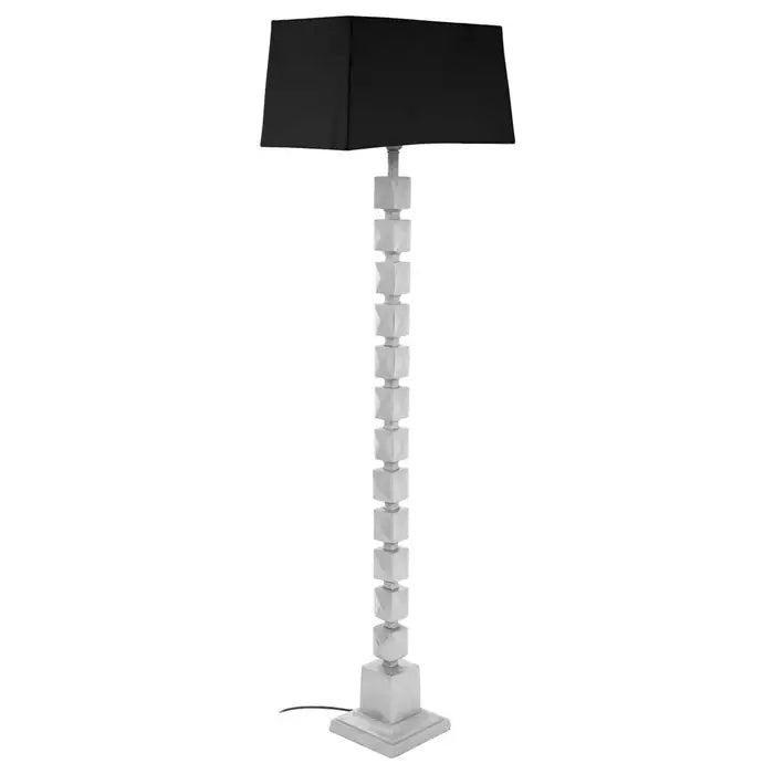 This striking floor lamp's vertical construction is anchored by a unique, cubic base, finished in a sleek nickel tone.
