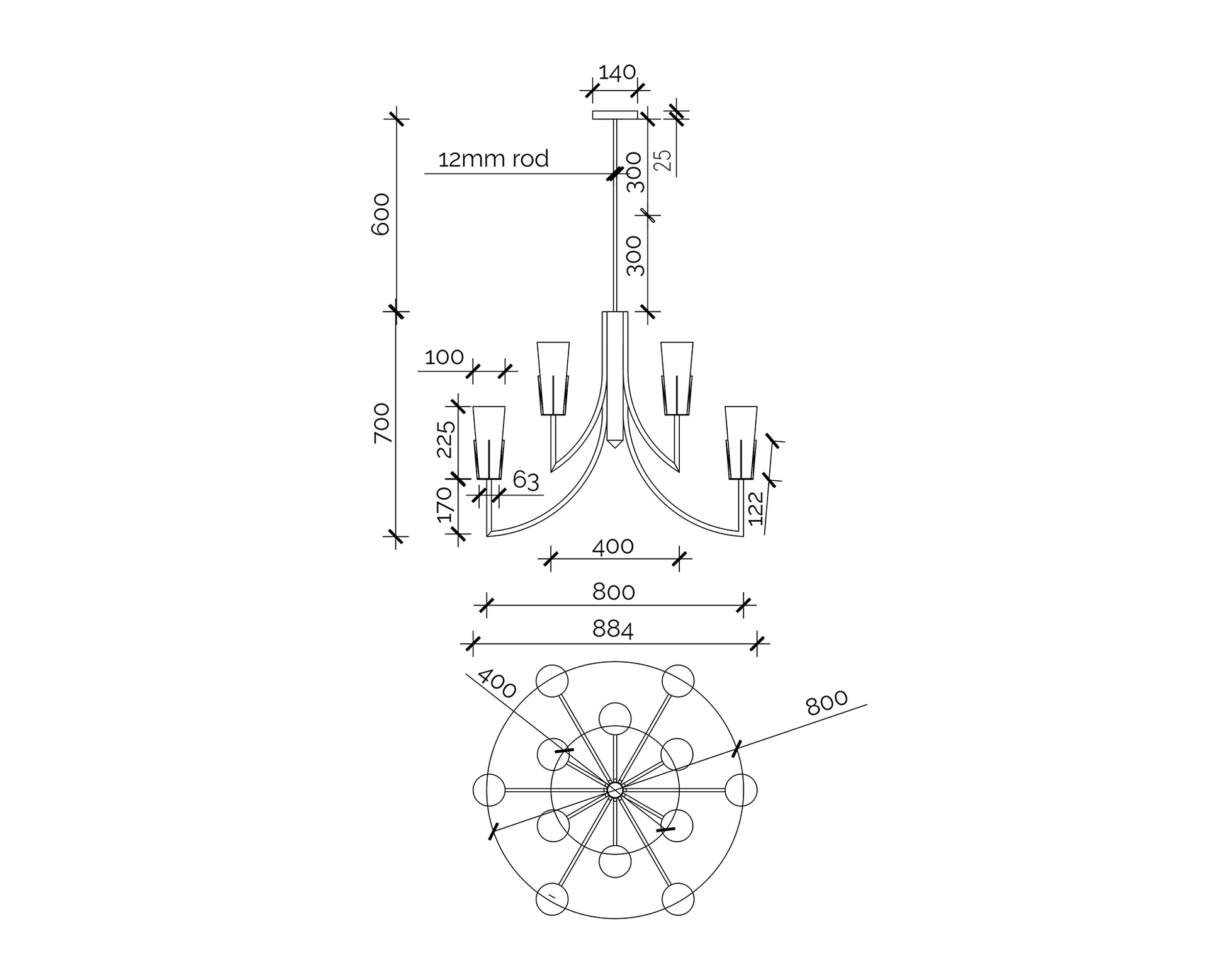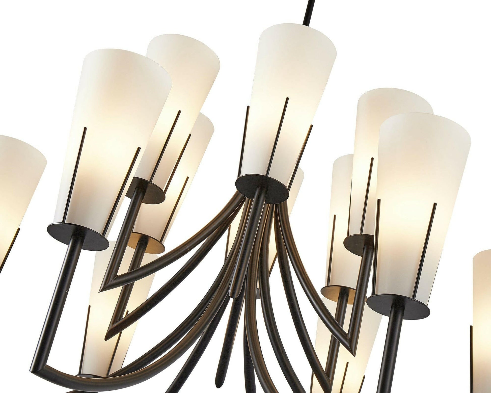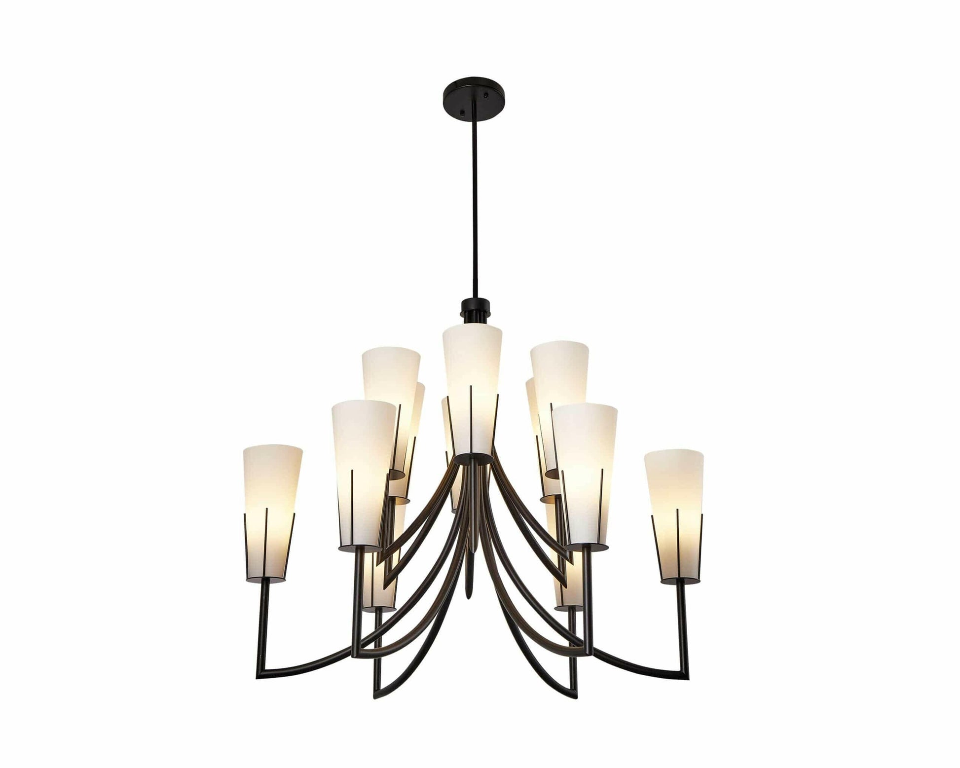 Enhance your interior with this The Magestic Chandelier, which is both serene and elegant, was designed to emanate an aura. The pendant’s matt black metal and glass details are instantly appealing. It has an eye-catching shape piece, complete with smooth curves that contrast with the luminous colouring. This chandelier is distinguished by a combination of soft and edgy elements. The Magestic, a wonderfully classic 12-shade pendant lamp, is the modern equivalent of a traditional chandelier, infusing your interior with instant glamour. (Light bulbs not included.. Requires 12 × E14, max 40W) Features: Matt Black Metal, White Glass, Rod length 1000mm (3 sections).