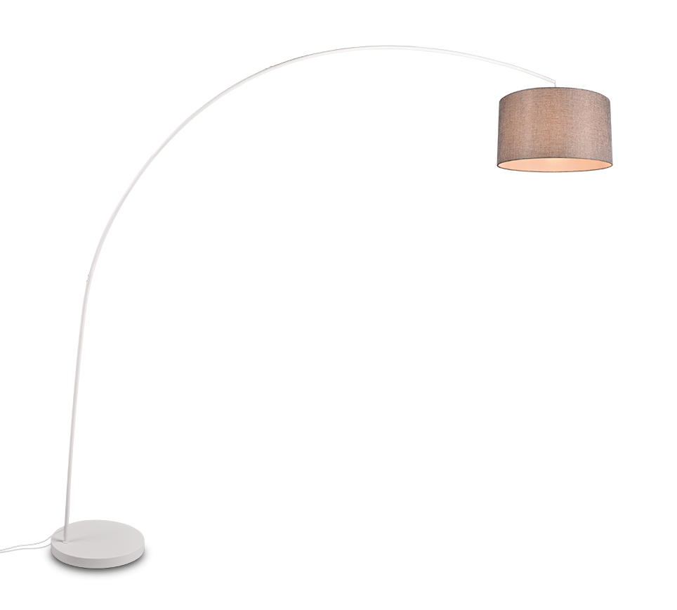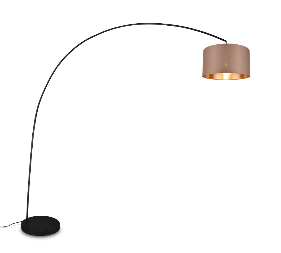 Arched luminaires add a modern touch to your home and at the same time radiate a pleasant sense of calm. This is also the case with the MANSUR floor lamp, which creates a warm atmosphere with its slender, curved frame and simple shade shape. The classic fabric shade directs the light upwards and downwards, creating a wonderful island of light underneath where you can read or relax. The MANSUR is particularly suitable for large living rooms, as it takes up a lot of space and is effective as a decorative element in its own right. The fabric shade is taupe on the outside and a reflective gold colour on the inside. The frame and base in matt black round off the luminaire perfectly. The use of LED light sources is recommended for energy-saving lighting. These are an ideal alternative to conventional halogen light sources and offer high light quality and energy savings of up to 80%. With LED light sources, you also benefit from a long service life and low heat generation while protecting the environment.