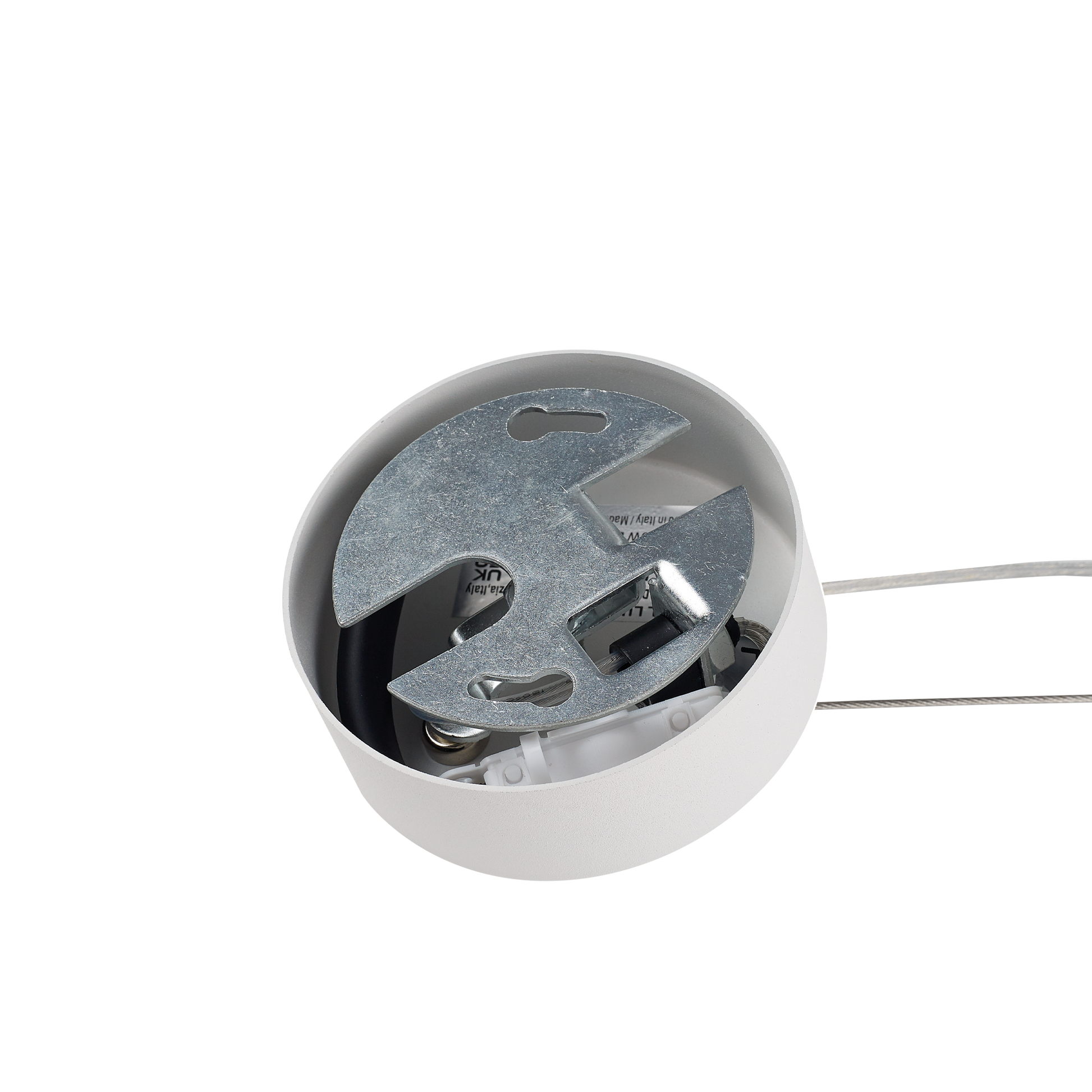 White metal frame. White spherical shape acid-etched blown glass diffuser. Steel cables adjustable in length.