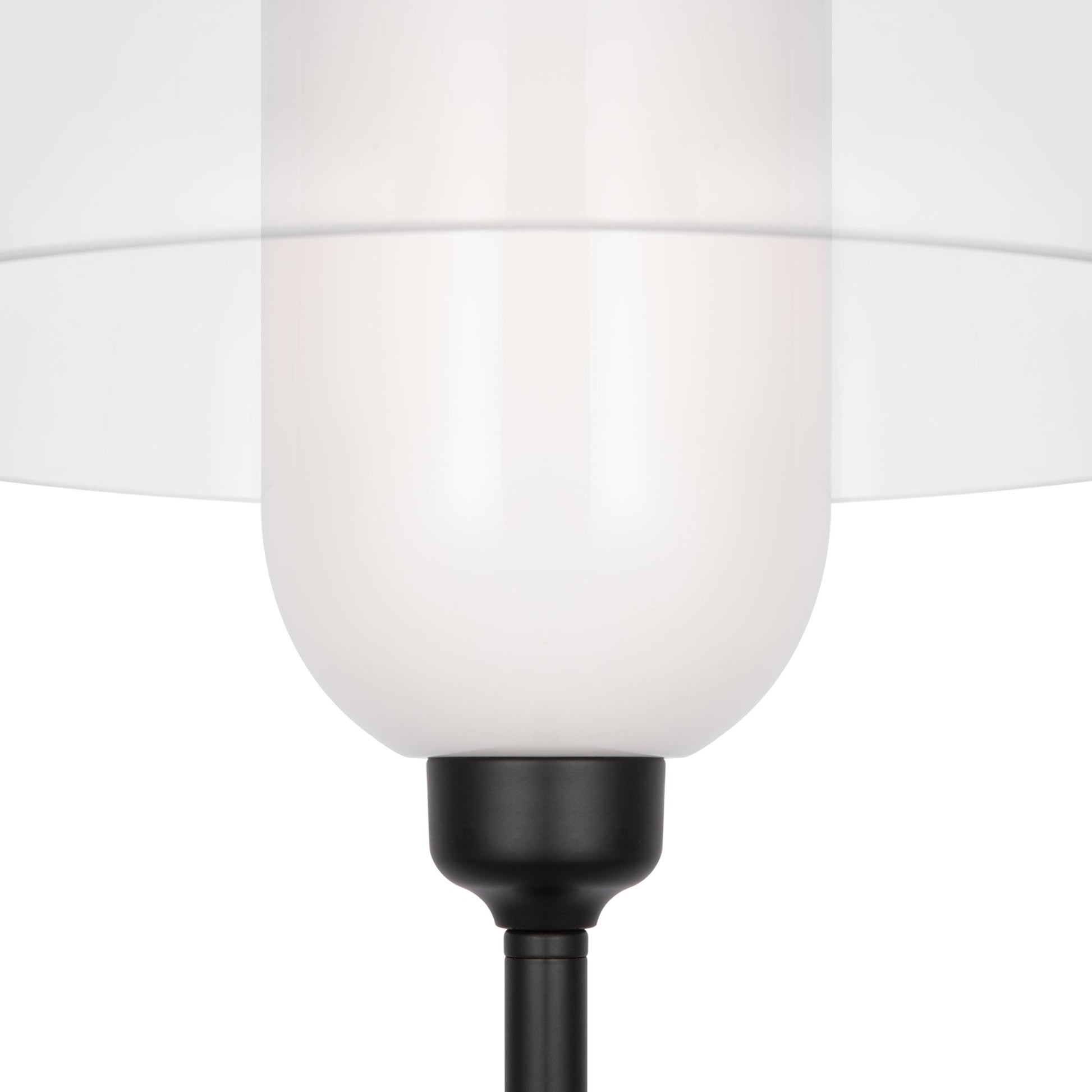 Metal fittings, shade — black. Lamps are stylized in the shape of an hourglass with a streamlined shape. Ceramic elements with glossy glaze. Pendant lamps with dome lamps made of white ceramics with transparent, black-and-white, gold-and-white and white glass. Adjustable height of pendant lamps.