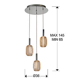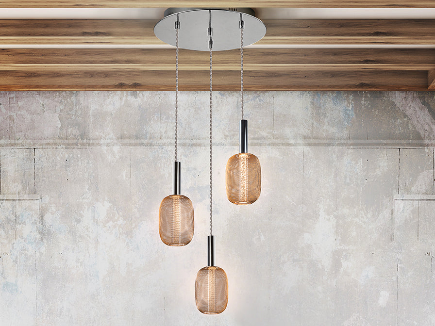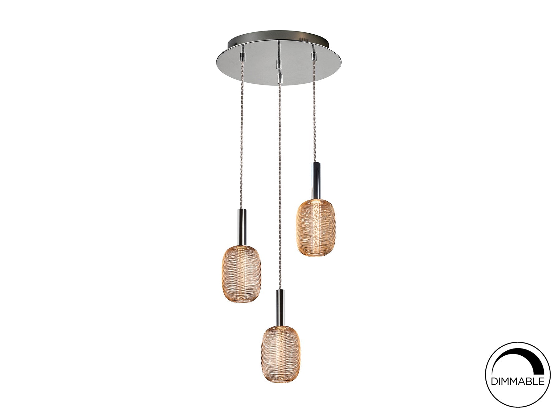 LED lamp of 3 lights made of chromed metal. Double shade with inner clear acrylic cylinder with bubbles and external oval of metal mesh in bright gold. 15W LED, 1350 lm, 3.000 K. DIMMABLE.