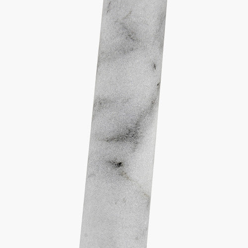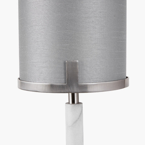 The Midland has the look of hotel-style for the home. An elegant yet contemporary floor lamp finished with a marble effect metal stem with brushed nickel details. The silk effect shade is held by a brushed nickel metal ring and has a slim profile perfect for any small space.