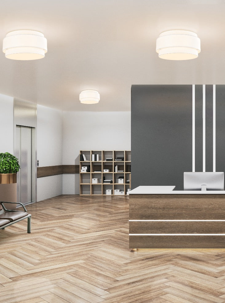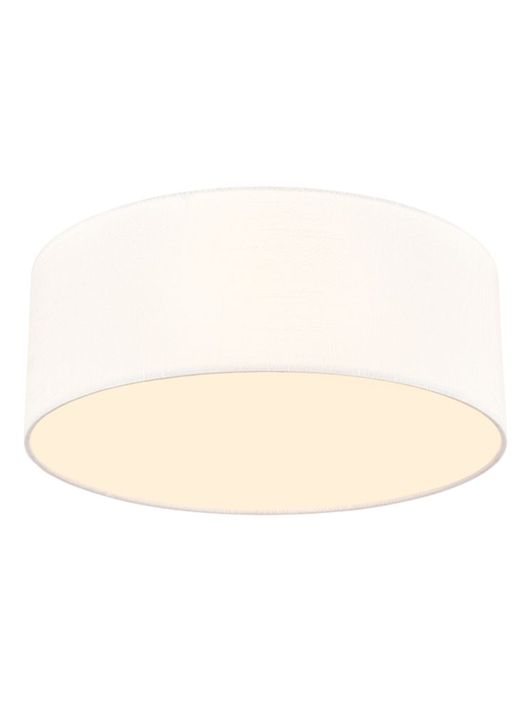 Flush fitting with cream textured fabric shades and acrylic diffuser at the bottom.