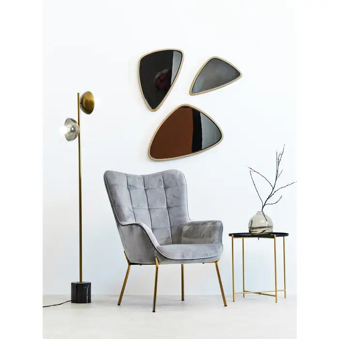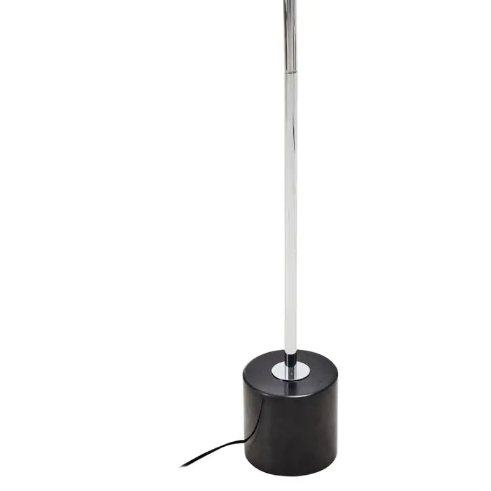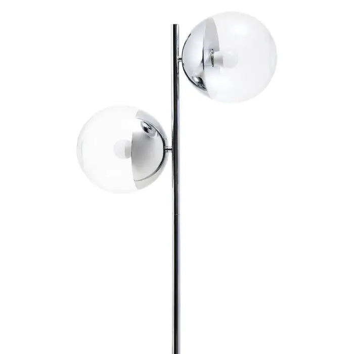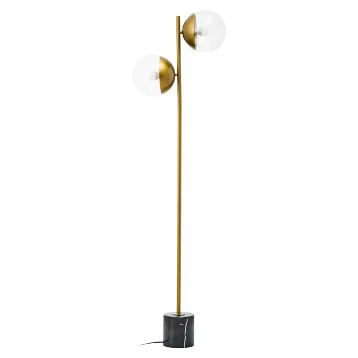 The Mirrored Majesty floor lamp is a sleek and stylish addition with gold finish metal stand, two glass globes, and a black marble base.