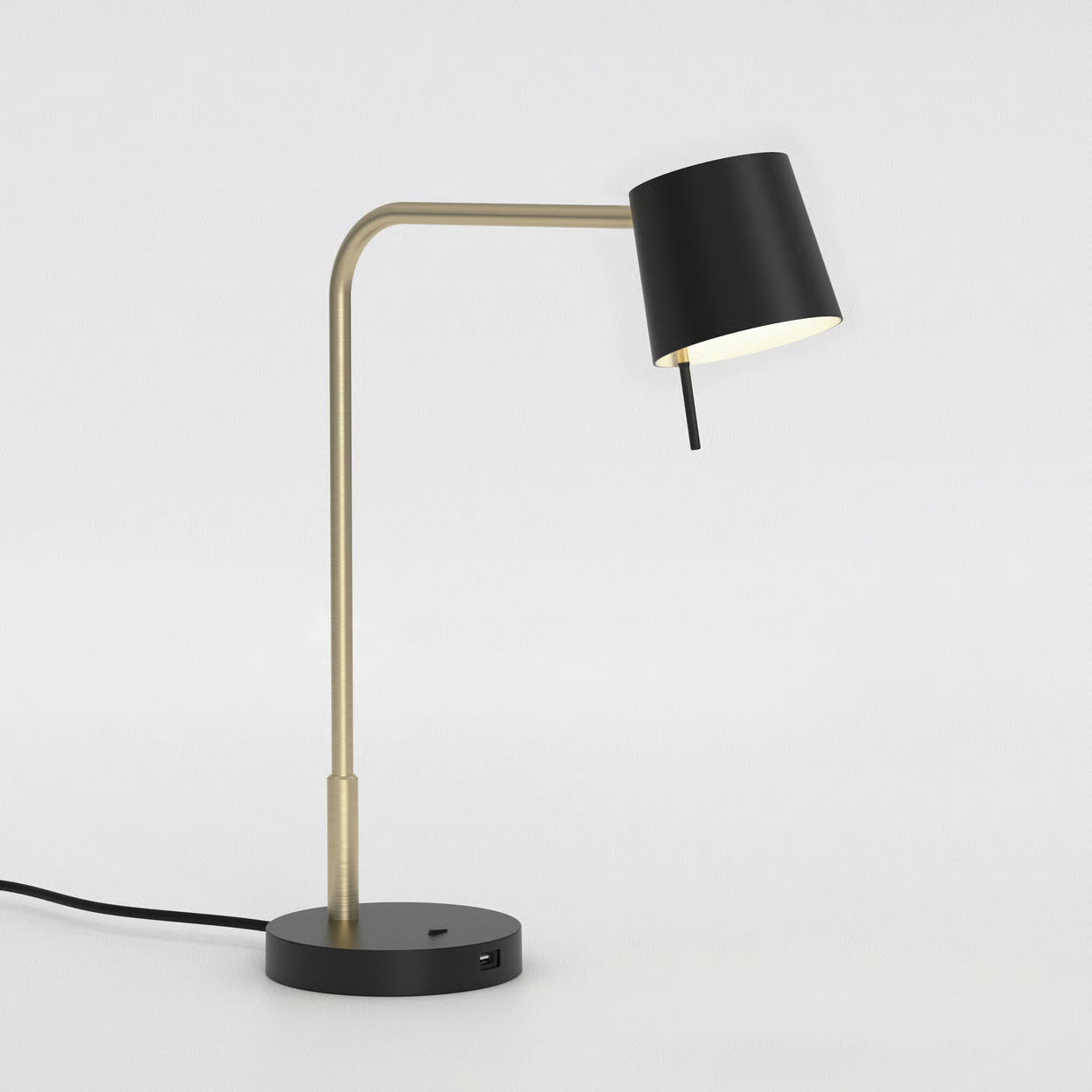 The Miura Desk USB is a timeless and extremely functional desk light. It features a custom-moulded diffuser for reduced glare and a hard wearing knuckle joint for easy adjustment. The neatly proportioned shade and body can be customised in combinations of matt nickel, matt gold and matt black, each grounded by a matt black base that features an integral switch and USB port.